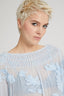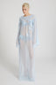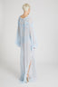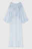 Kaftano lungo in pura seta con manica lunga e scollo pari. Lo scollo è arricchito da una particolare lavorazione plissettata concentrica realizzata a mano alternata da un bordinoi in pizzo valencienne. Rifiniscono il capo i ricami floreali tridimensionali realizzati a mano con fettuccia di seta.