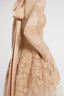 Applicazioni di pizzo floreale a piccolo punto su corpo e maniche, effetto degradè verso la gonna