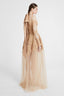 Il tulle sulle spalle e sul décolleté lascia delicatamente intravedere la pelle, mentre le applicazioni di pizzo floreale a piccolo punto, cucite a mano, decorano il corpo e le maniche dell’abito, sfumando in un raffinato effetto degradè verso la gonna.