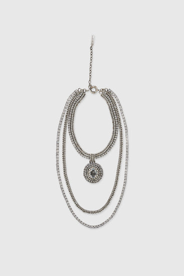 Suggestioni bizantine e artigianalità d’eccellenza si intrecciano in questa collana multifilo firmata Ermanno Scervino. Sottili catene in ottone sono ornate da zirconi tagliati in diverse forme — carré, rosette e baguette — che si sovrappongono in una composizione armonica e architettonica. Il gioco di luci che ne scaturisce è vibrante e prezioso, culminando nel motivo centrale: una cornice di cristalli ovali incastona con eleganza grandi pietre stalcate, dando vita a un effetto scenografico di grande intensità. Ogni elemento è saldato a mano, a testimonianza della maestria artigianale della maison.