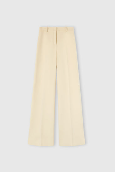 Volume ampio e costruzione impeccabile per questo pantalone palazzo in pura lana vergine, protagonista della sfilata FW25/26. La linea maschile, enfatizzata dalla gamba fluida e dritta, si arricchisce di una sofisticata leggerezza nei look proposti in passerella. Il capo è stato infatti abbinato alla maglia in puro cashmere con scollo rifinito da un cordoncino incrociato, per un risultato di raffinato equilibrio tra essenzialità e sensualità.