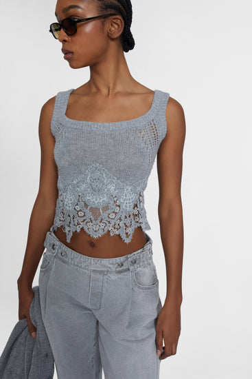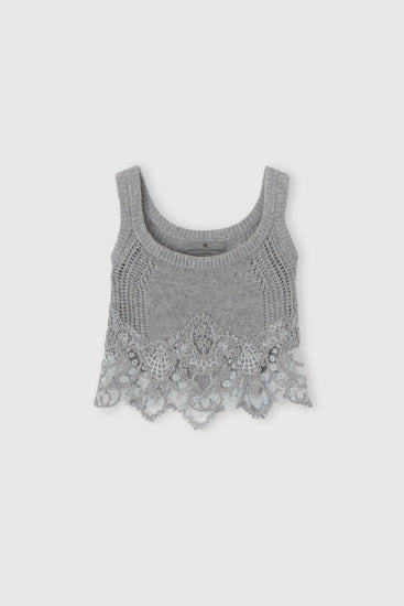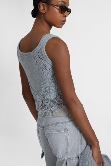 Top in puro cashmere con pizzo rebrodé e inserti a jour