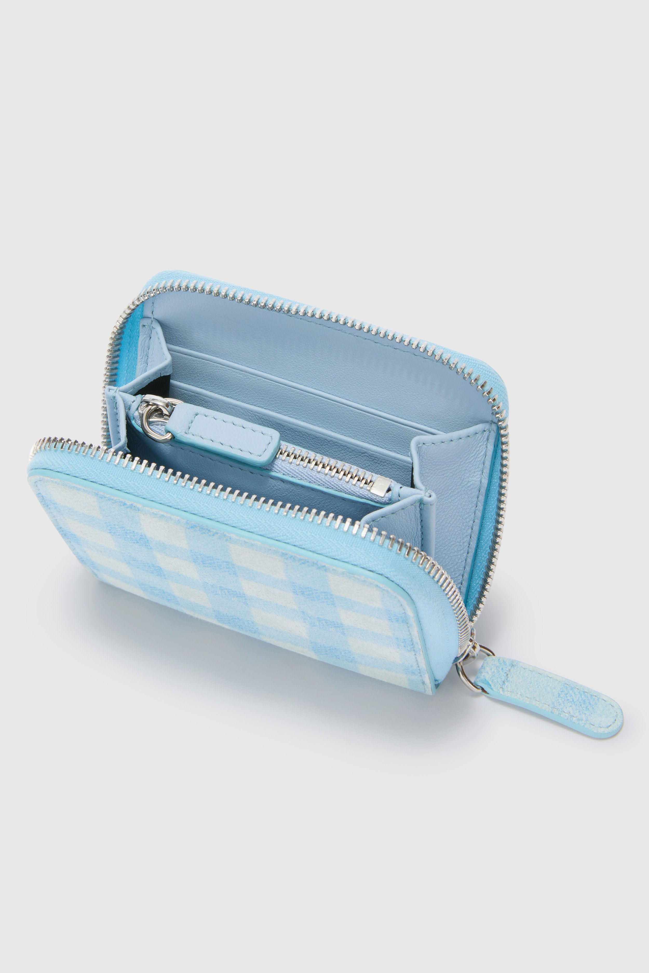 Il portafogli ziparound piccolo è realizzato in morbido camoscio con stampa vichy e dotato di chiusura con zip in metallo, che garantisce sicurezza e praticità. L’interno è organizzato con scomparti multipli, mentre la struttura resistente lo rende perfetto per l’uso quotidiano, combinando estetica e funzionalità secondo lo stile Ermanno Scervino.