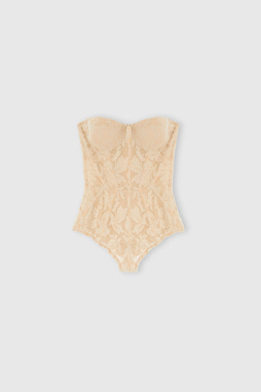 Sensual and sculptural, this corset-body captures the perfect balance between body architecture and couture refinement. Entirely crafted from the new piccolo punto floral lace—an exclusive by Ermanno Scervino—it envelops the silhouette with timeless elegance. The structured cups and internal boning shape the body with tailored precision, while the back fastening with lingerie hooks and a hidden zip ensures a flawless, comfortable fit. Presented on the FW2526 runway, this piece is made to be seen, whether as refined lingerie or a bold style statement.