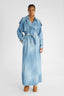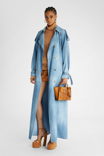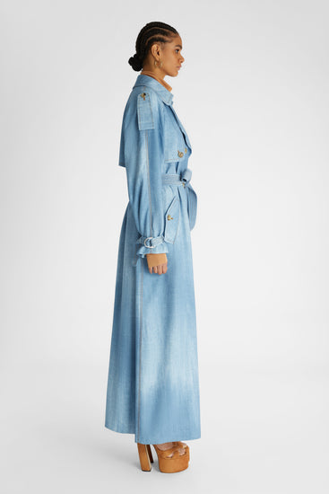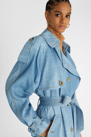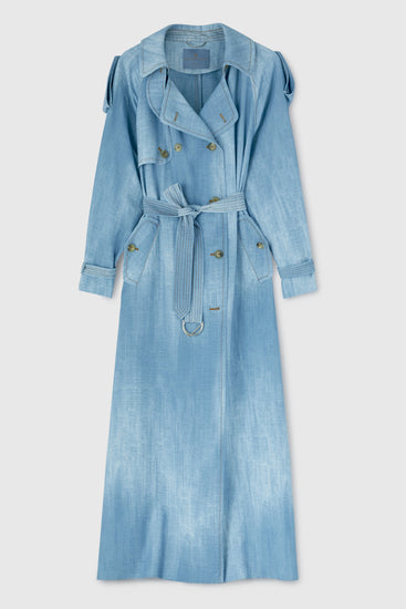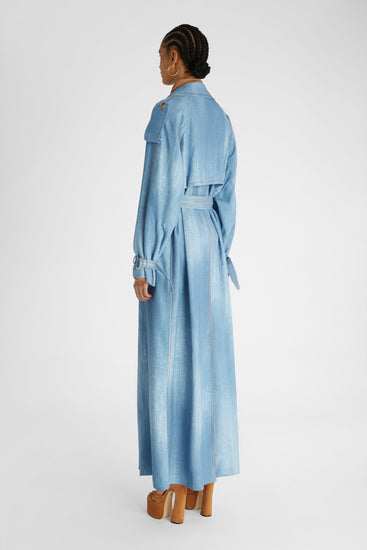 Long double-breasted trench coat in denim-print marocain. The garment is embellished with handmade stitching and golden military-inspired buttons.