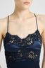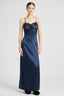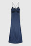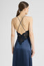 Elegance and sensuality blend in this long slip dress, crafted from stretch silk with a soft and luminous touch. The fine straps cross at the back, creating a refined and feminine detail. The rebrodé lace application on the front neckline extends along the sides and finishes at the lower back, forming a delicate play of transparency that enhances the silhouette in a seductive and sophisticated way.