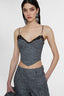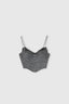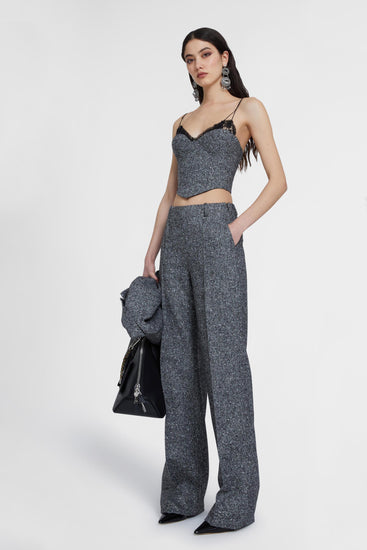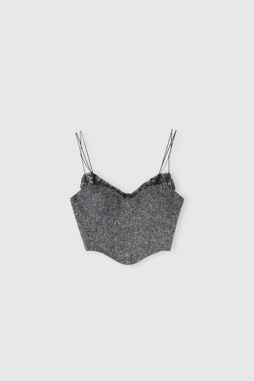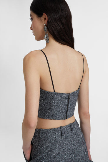 A sophisticated and modern bustier top, crafted from a wool blend with an elegant black and white herringbone print. Featuring thin straps and a zip at the back, the design plays with the contrast between the fabric and the black lace, which delicately peeks out from the cups, creating the effect of an overlay on the lingerie.