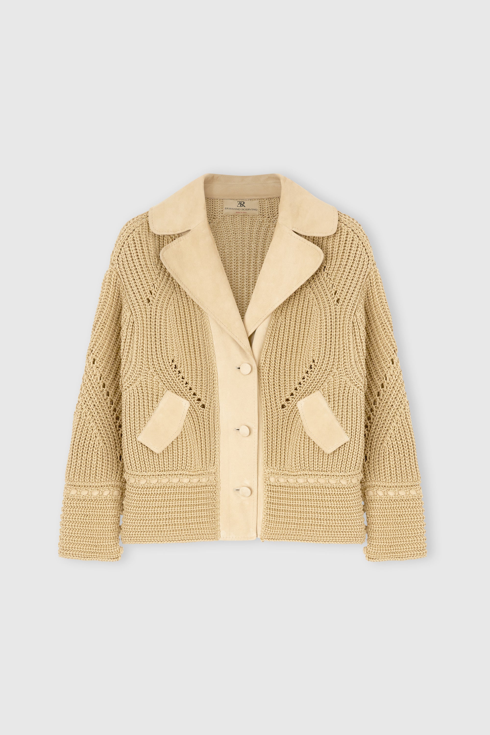 Special attention to the braided details at the hem and sleeve cuffs, where suede leather is woven through the pearl stitch eyelets, creating an elegant play of texture and movement.