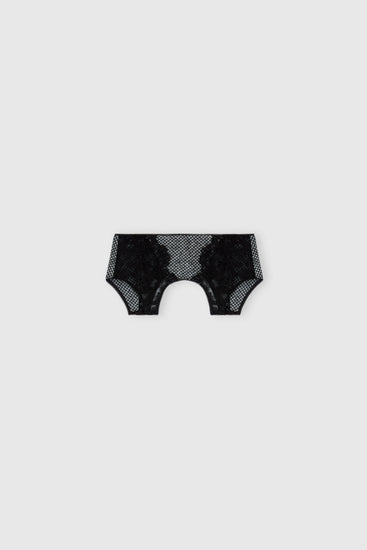 Elegant and bold, this garter belt in pure silk with a pied de poule print combines functionality with refined style. Delicate hand-made lace appliqués enrich the piece, giving it a unique artisanal character. Designed both for its traditional use and as a must-have detail of the Autumn/Winter 2025–26 runway, it is showcased under palazzo pants or sheerly under skirts, becoming a distinctive and striking element of the collection.