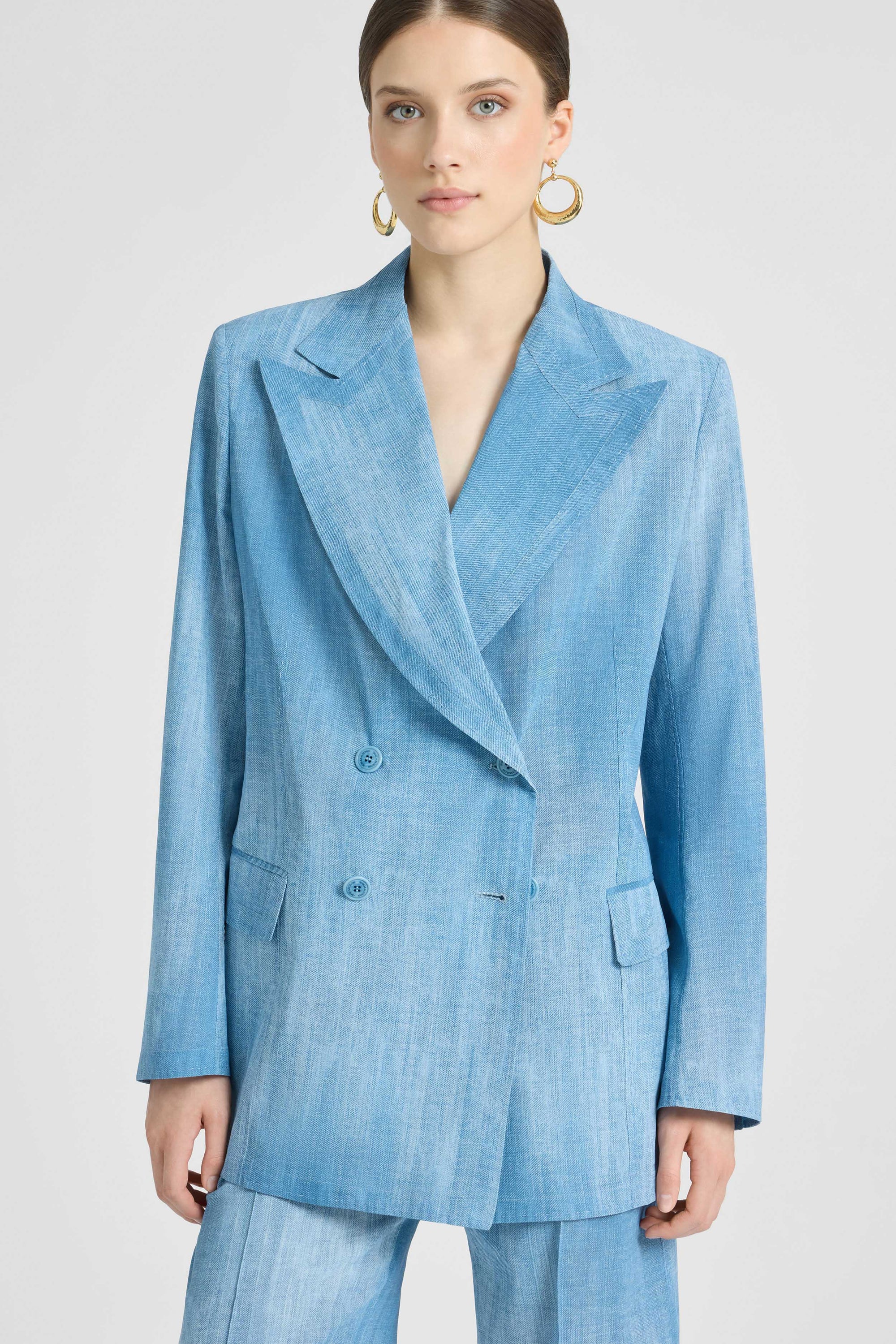 Double-breasted jacket in silk-effect chiffon, jeans print
