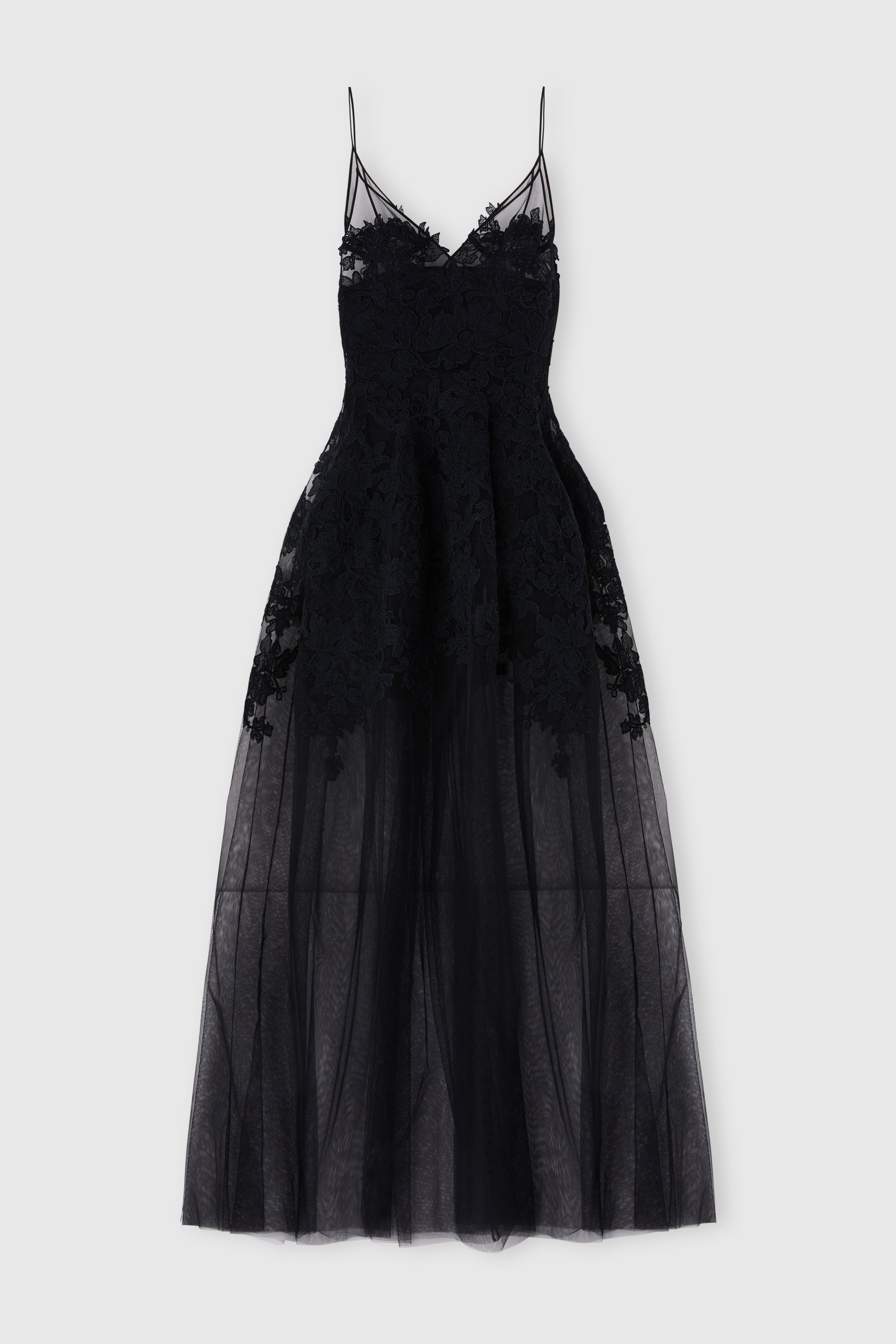 Crafted entirely in tulle and rebrodé lace, the floral lace motif gradually fades along the skirt, which is intentionally left in sheer tulle only, offering a refined contrast of textures and transparency that celebrates sensuality.