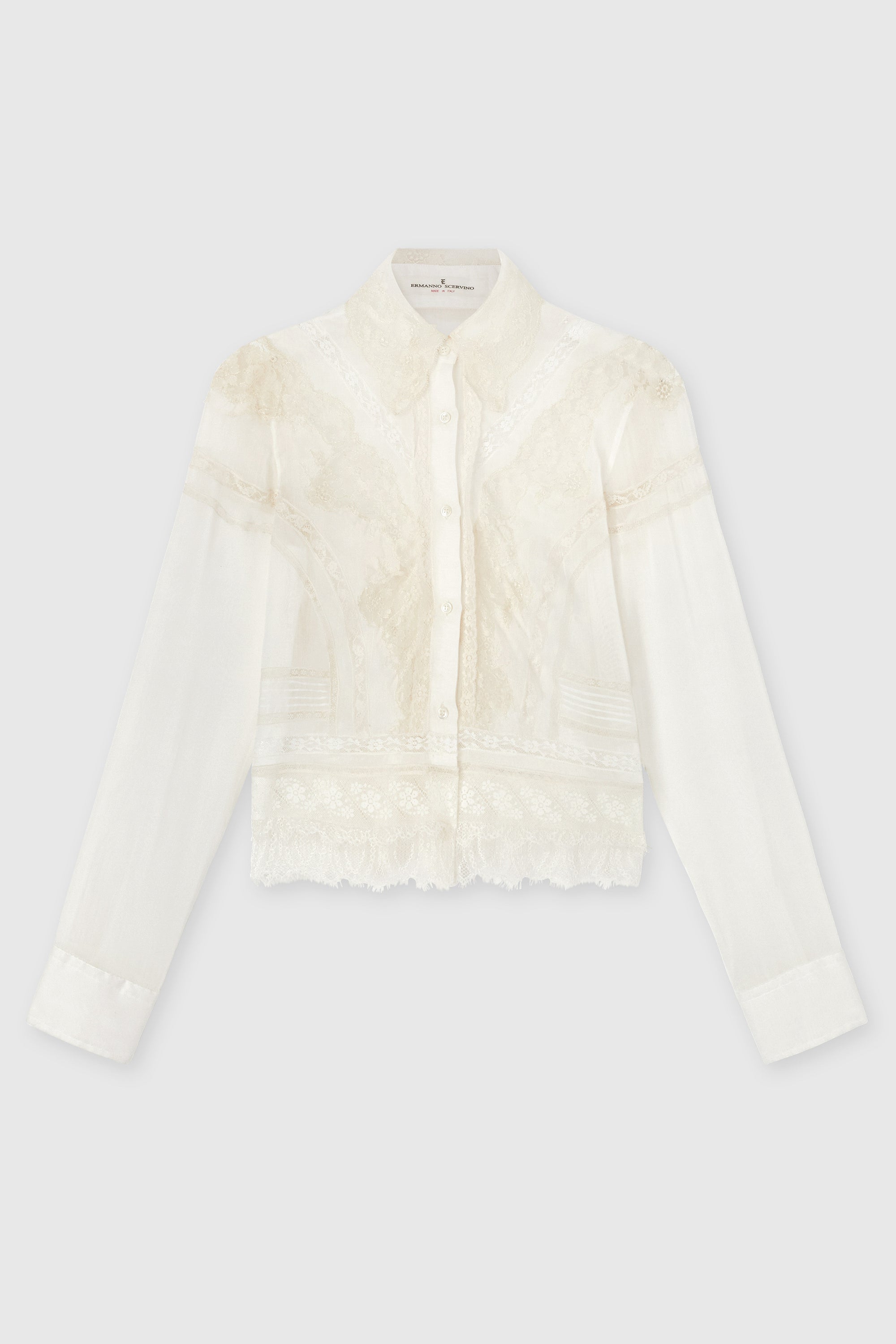 A shirt that combines lightness and craftsmanship, made from a refined cotton and silk muslin blend with a cropped cut. The piece is enriched with hand-applied Rebrodé and Valencienne lace arranged in diagonal lines to enhance the feminine silhouette. The same lace decorates the back, while the hem features geometric-patterned Valencienne lace with a scalloped edge, creating a sophisticated play of transparency in harmony with the rest of the shirt. The collar is adorned with scalloped Rebrodé lace, adding a refined and distinctive detail.