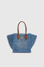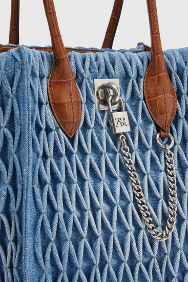 Maggie Media with a double combination of materials: denim on the body and crocodile-print leather on the handles. The denim canvas undergoes a treatment that makes it soft to the touch, while the aged effect is handcrafted and emphasises the handmade smock stitch work. The fastening is personalised and features a logoed lobster clasp with a metal chain, as do the feet that protect the bottom. Lining, pockets and details are in leather, as is the detachable shoulder strap. Measurements: 25*25*10