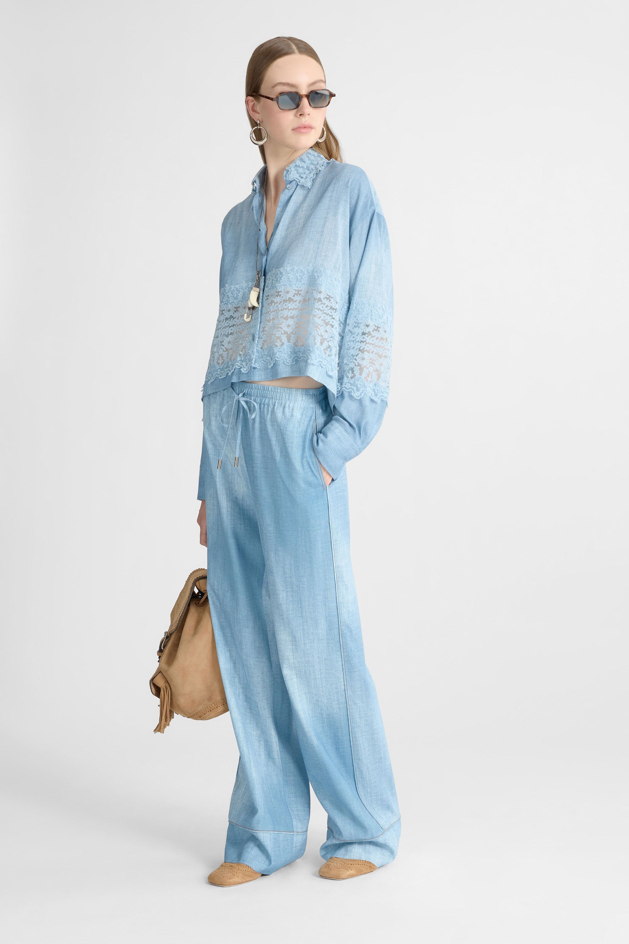 Pajama-style cut with side and hem piping inspired by jean topstitching.
