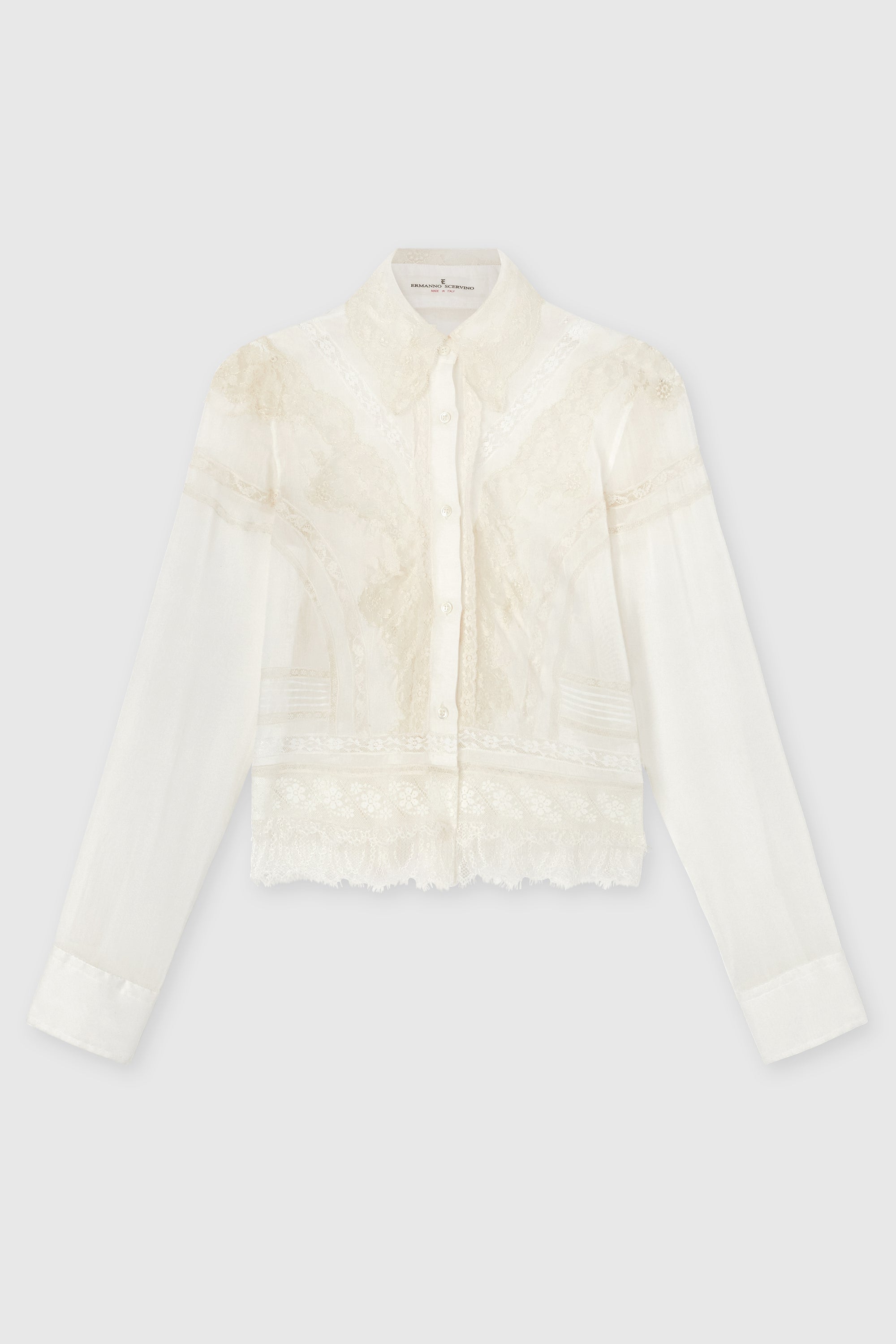 Cropped Cotton and Silk Muslin Shirt with Rebrodé and Valencienne Lace