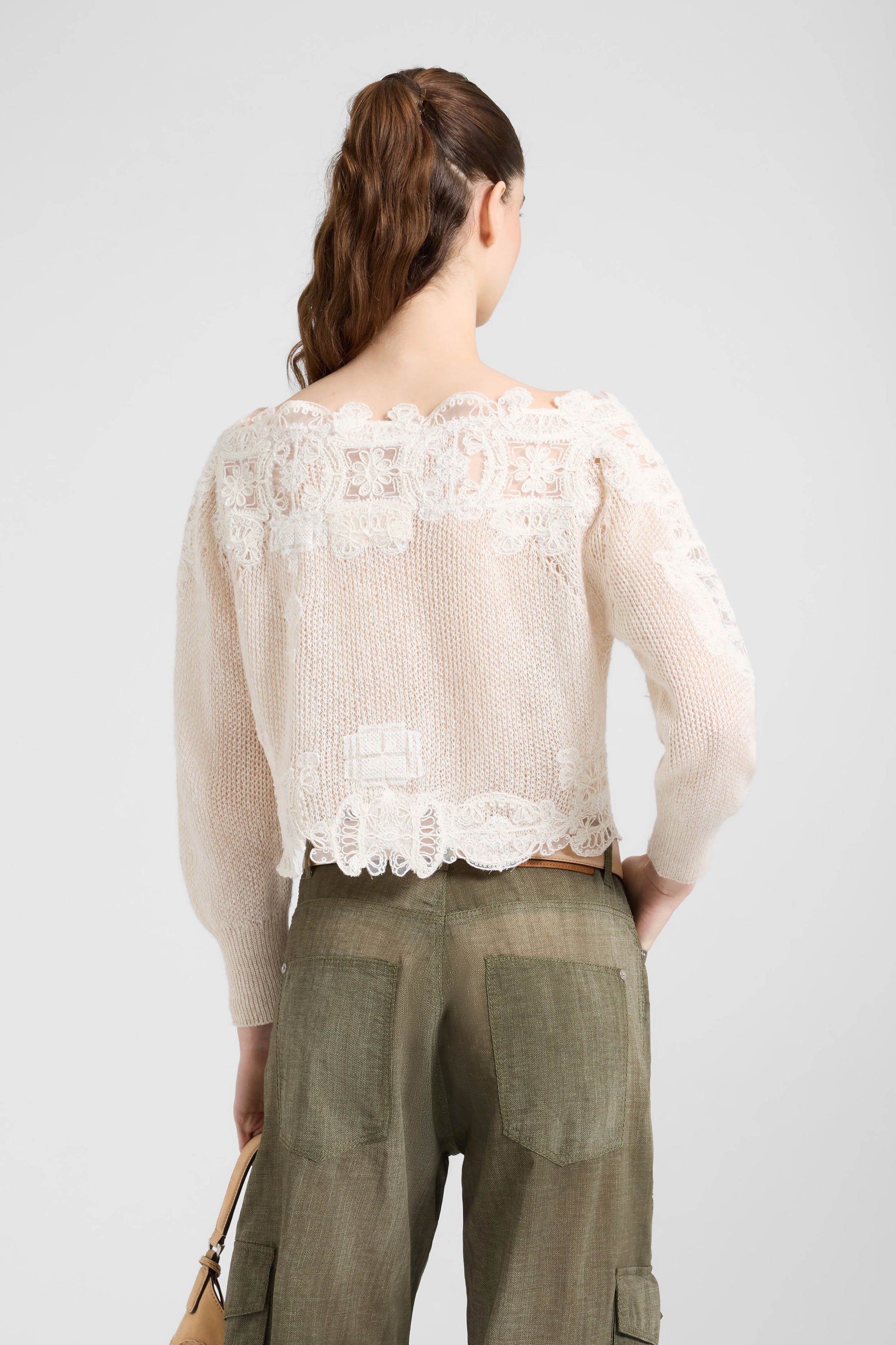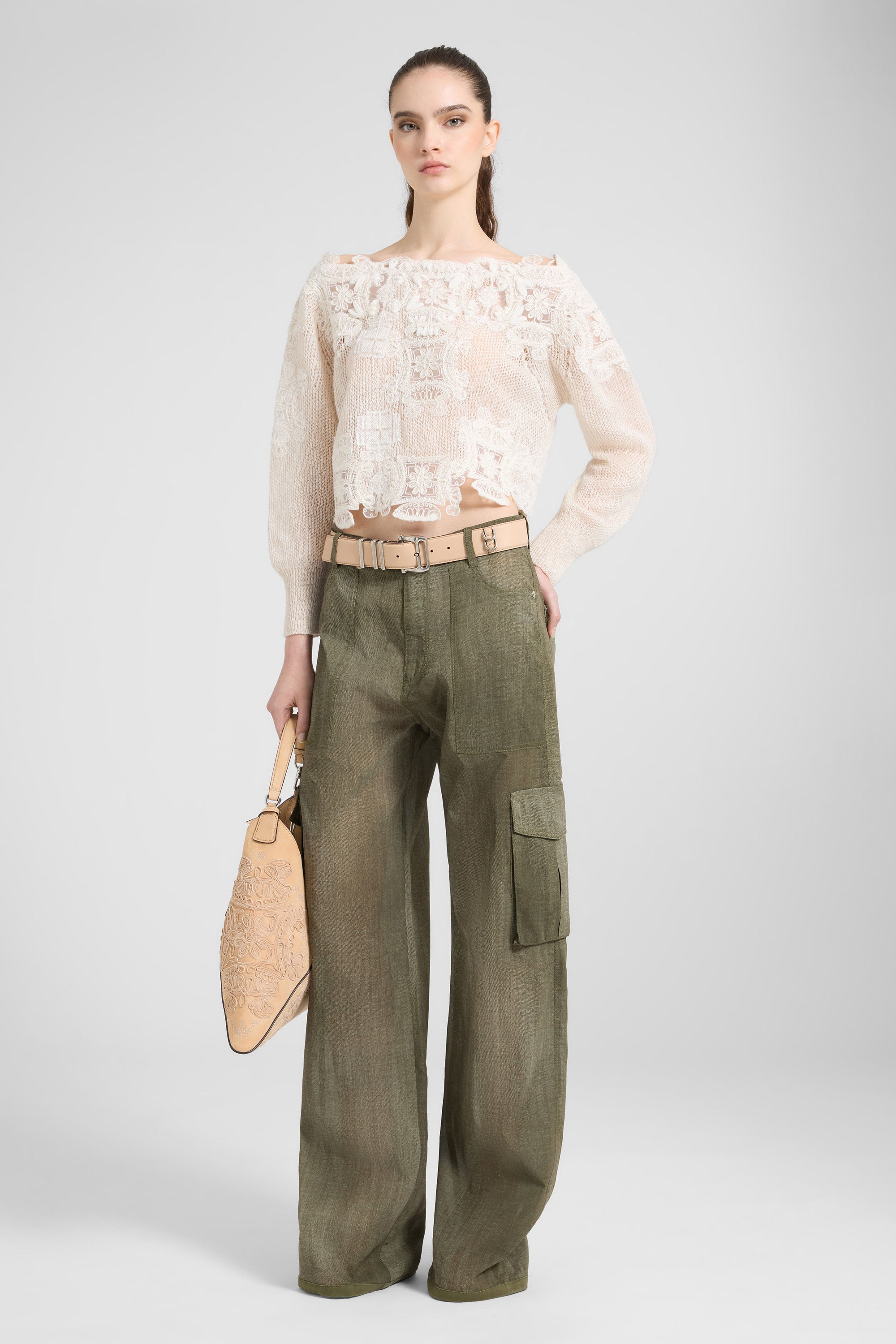 The true highlight is the chiffon embroidery inspired by maiolica motifs, crafted with cords in the same yarn as the sweater. A precious detail adorning the shoulders and neckline, extending to the front hem and back, creating an elegant play of peekaboo. Every movement enhances the fabric’s delicacy and the artisanal care of the craftsmanship.