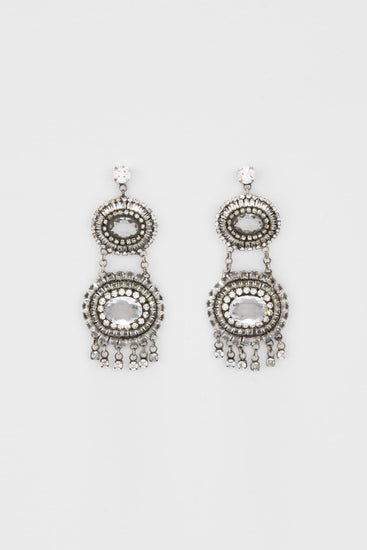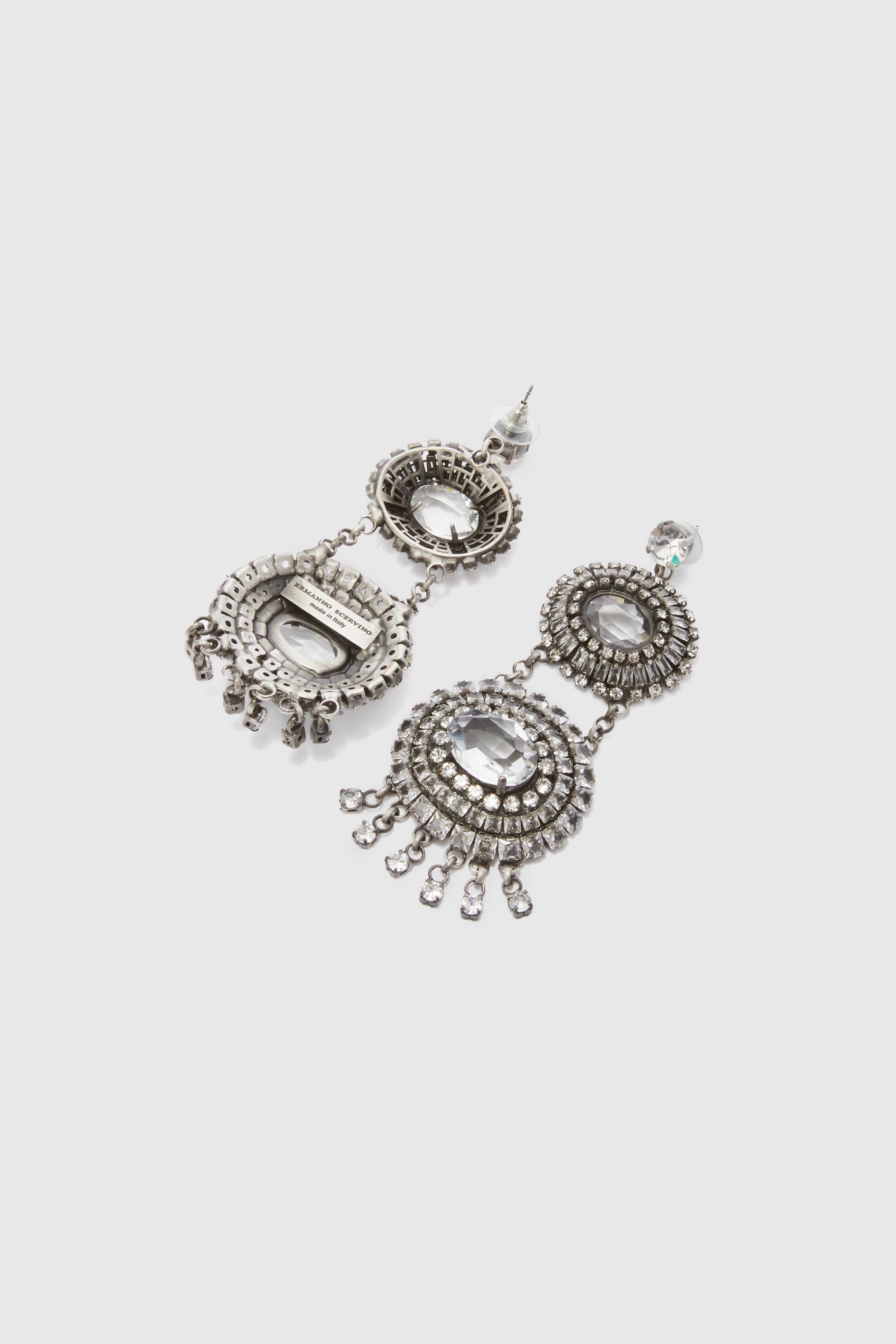 Full of charm and opulence, these chandelier earrings by Ermanno Scervino reinterpret the Byzantine aesthetic with a luminous and contemporary elegance. The pendant structure develops in a double oval frame: a smaller one, close to the lobe, and a larger one that completes the design vertically, both adorned with hand-set crystals. The overlapping of the shapes creates a refined play of volumes and reflections, in perfect harmony with the spirit of the collection. An accessory that gives light and personality even to the most essential look.