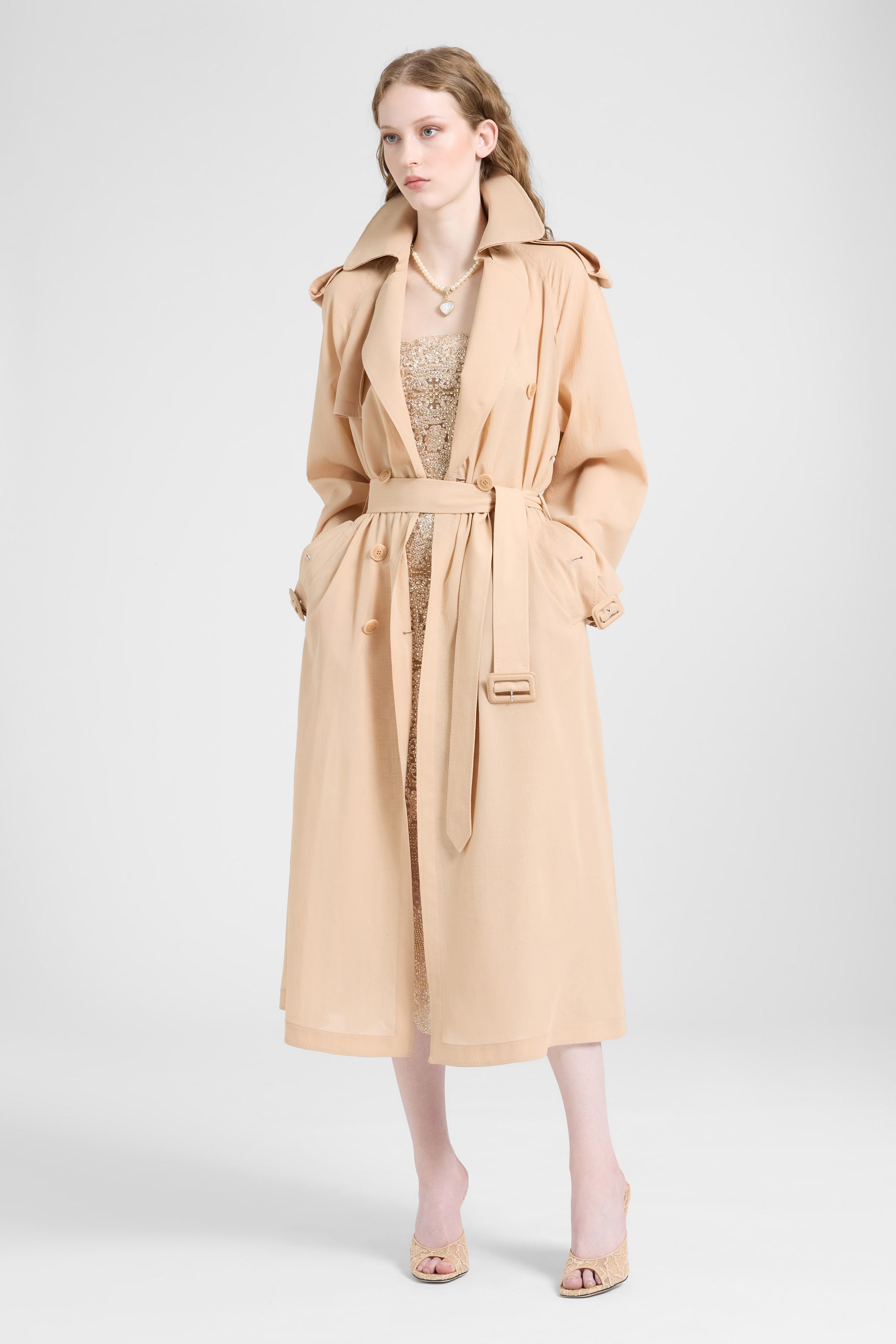 Styled with double-breasted georgette chiffon trench with nappa leather buckles