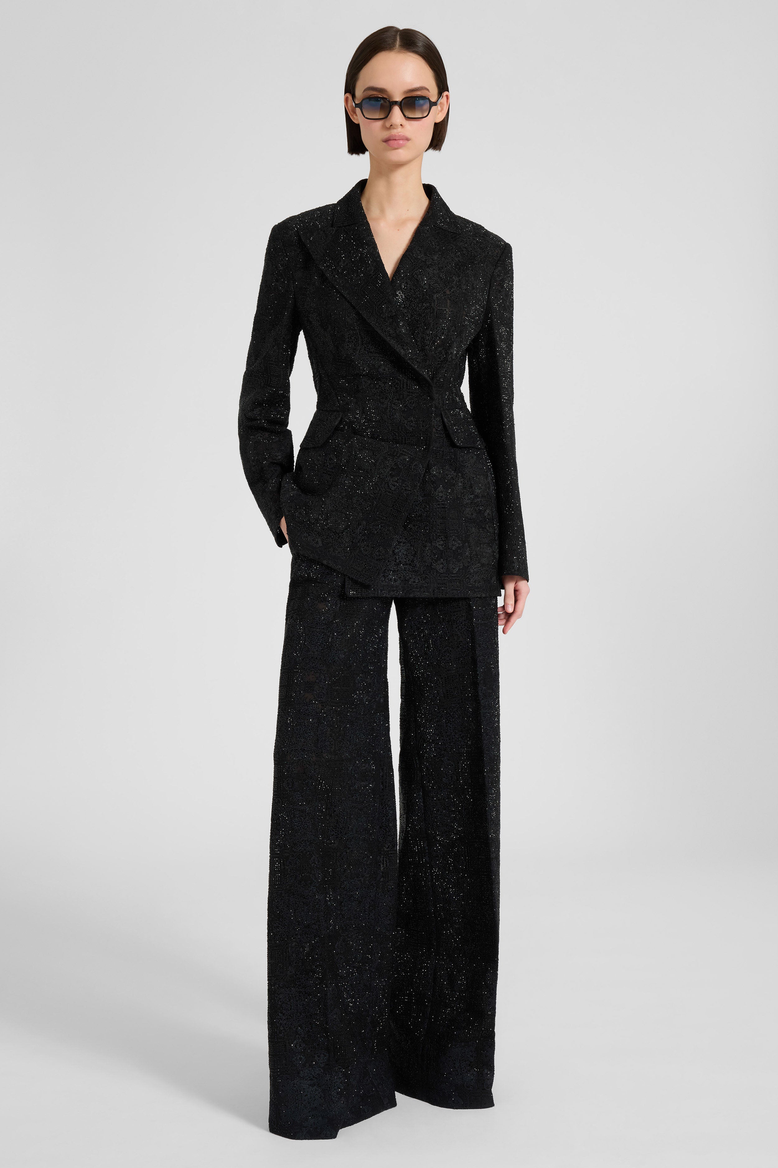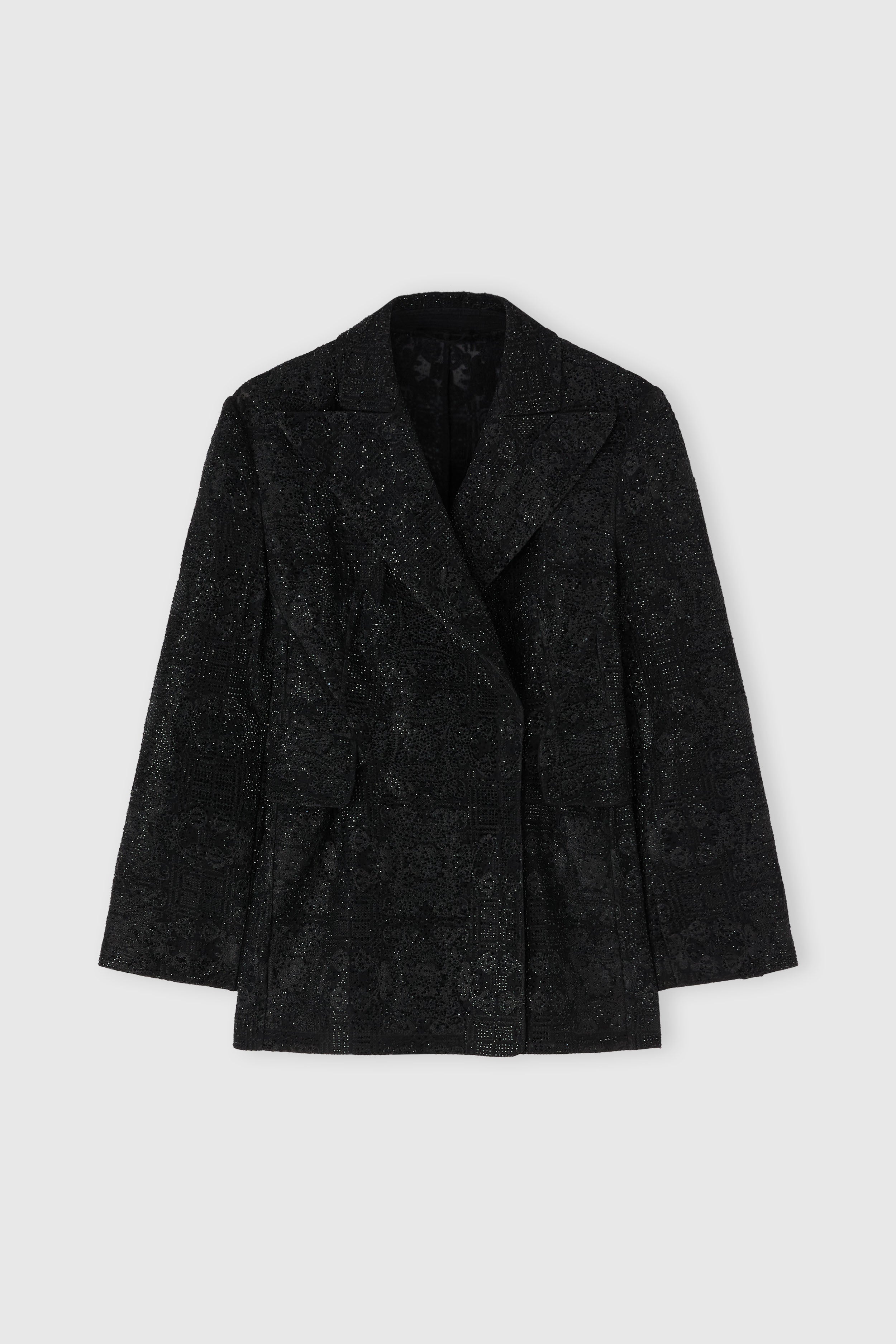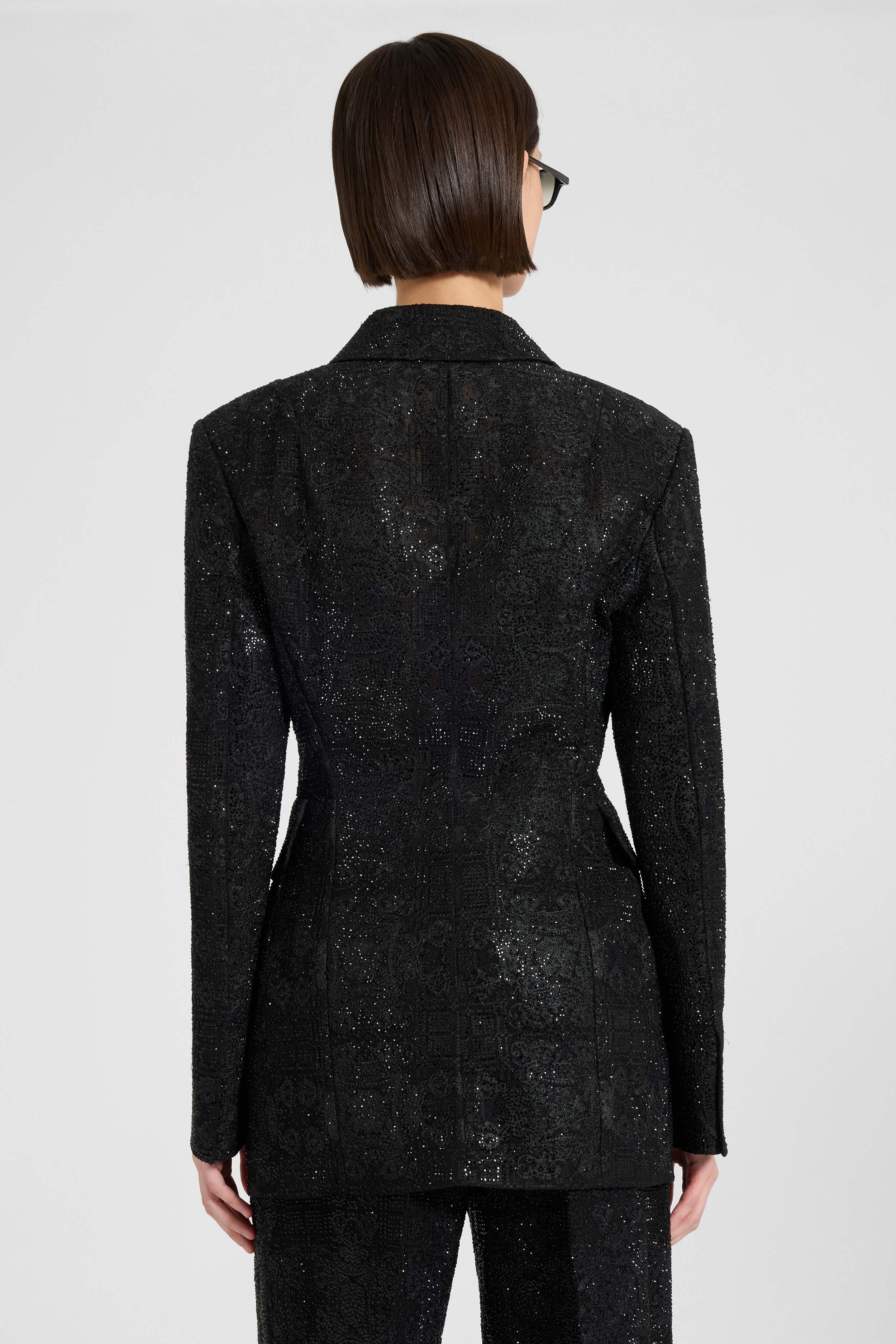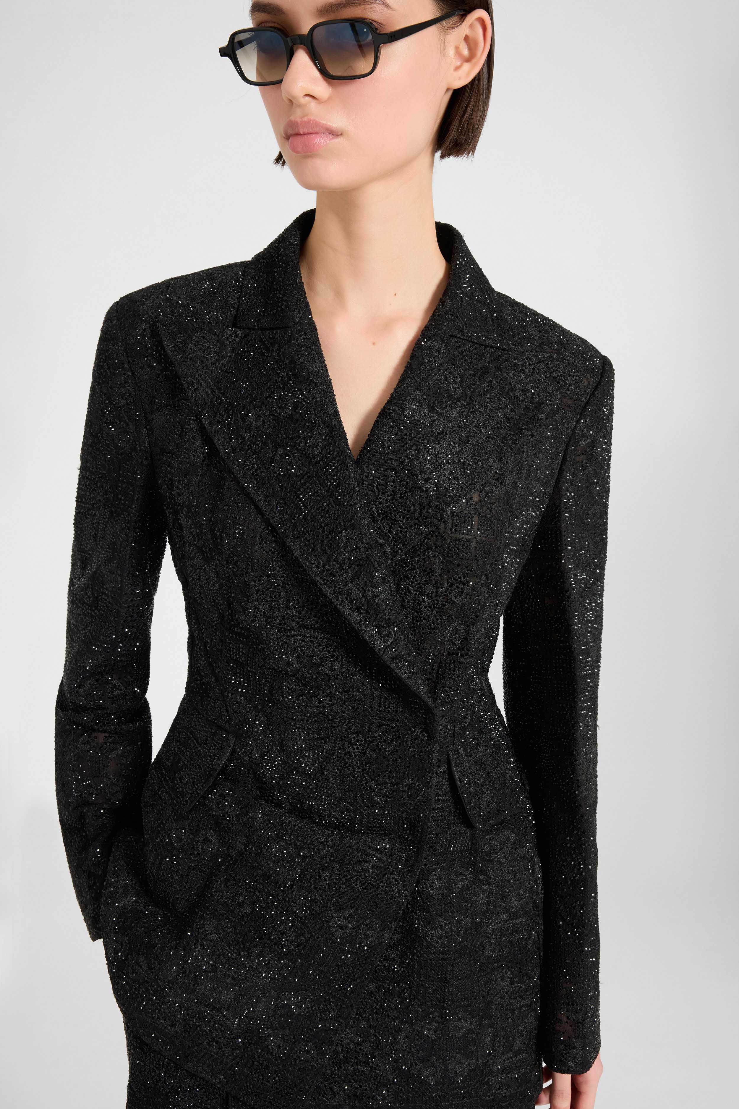 Double-breasted jacket in lace bonded with chiffon with hand-applied crystals