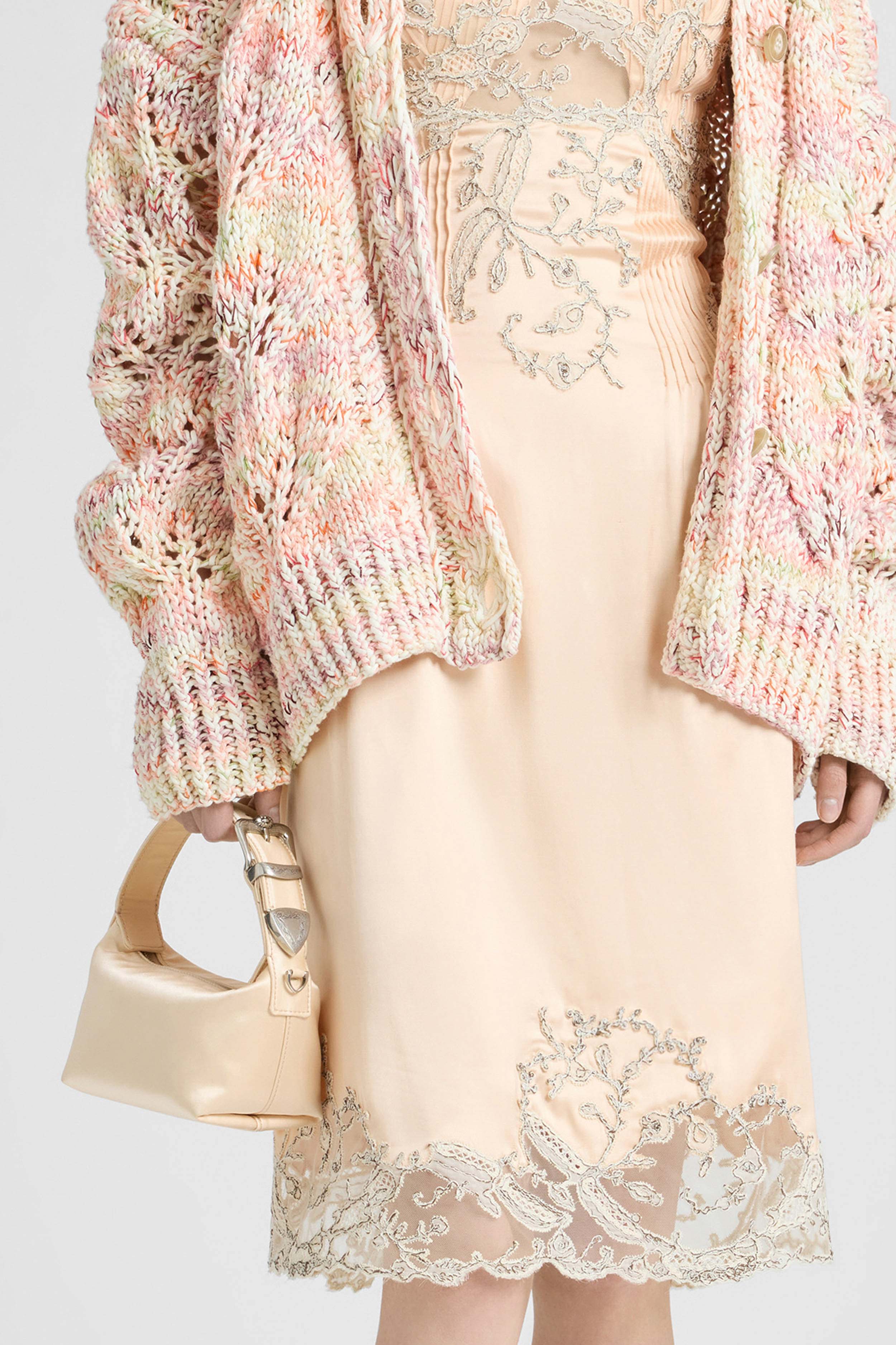 The Candy bag is crafted in smooth, luminous satin coordinated with the clothing, featuring a zip closure for practicality and security. The adjustable handle, with a bespoke buckle, combines functionality and style, while the fringes on the sides and perforated corners echo the collection’s signature motif, adding movement and character to the accessory. Perfect for completing refined and contemporary looks, Candy merges elegance and versatility in a compact, distinctive format.
