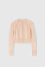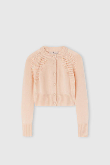 Cropped cardigan in pure cashmere with covered buttons and jour stitching