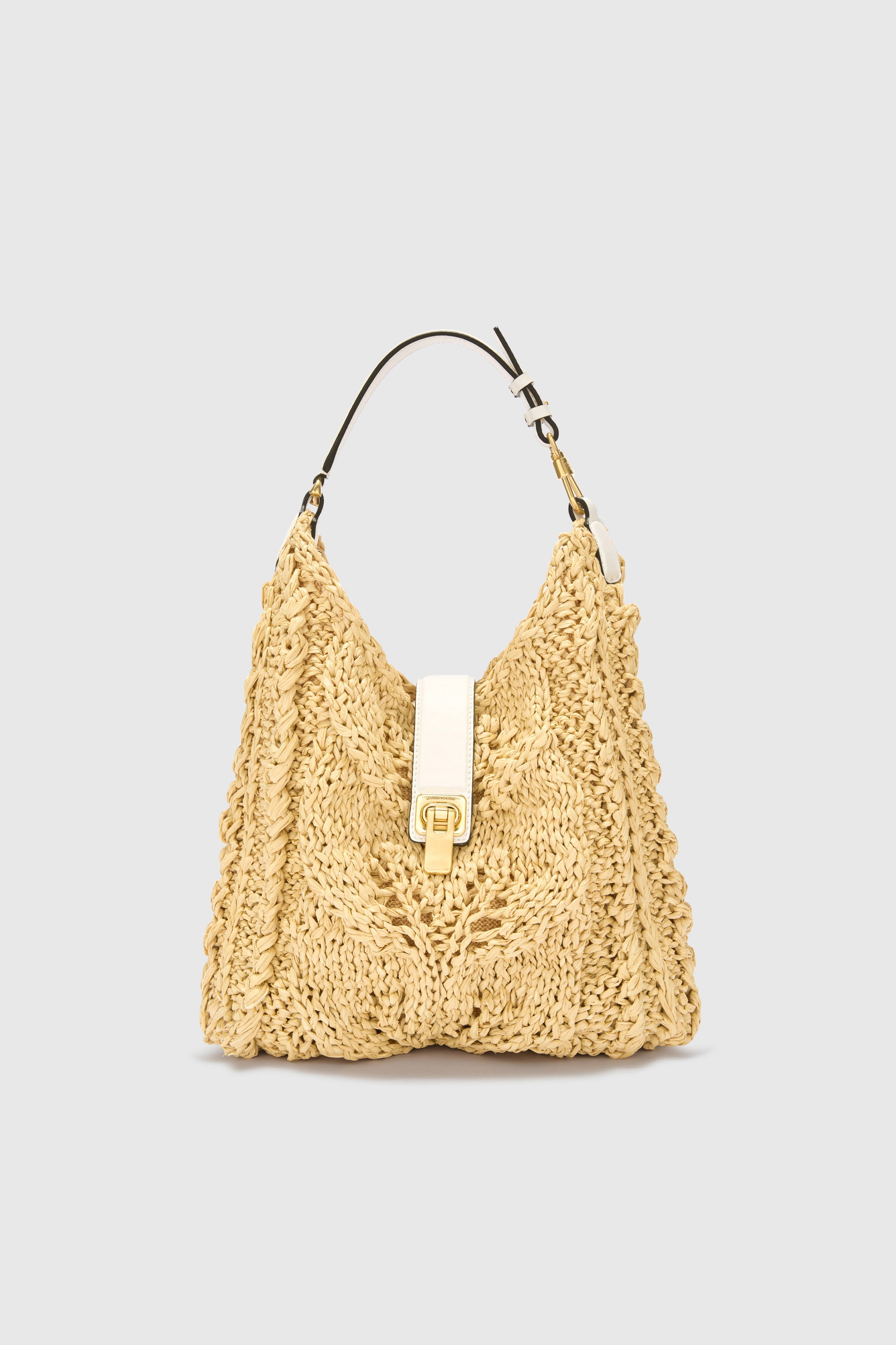 The natural raffia Clio bag is entirely handcrafted using raffia fibers, an iconic material of the Maison. The knitted construction creates a soft and sophisticated texture, while the minimalist Clio design is elevated by a metal clip closure and a logo-engraved carabiner—details that perfectly combine functionality and style. Versatile and lightweight, it effortlessly complements both city and vacation looks.