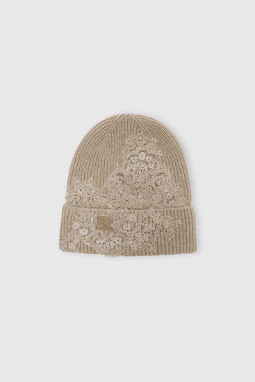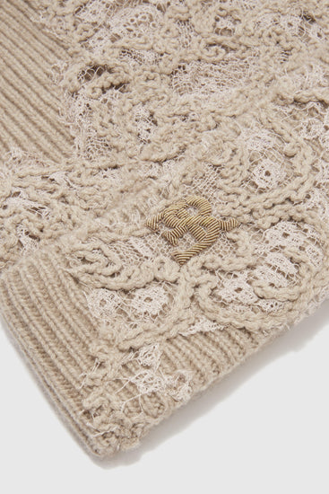 Pure cashmere hat with embroidered logo and rebrode lace