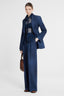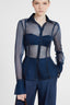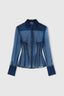 Front placket, collar, and cuffs in opaque blue denim-print organza