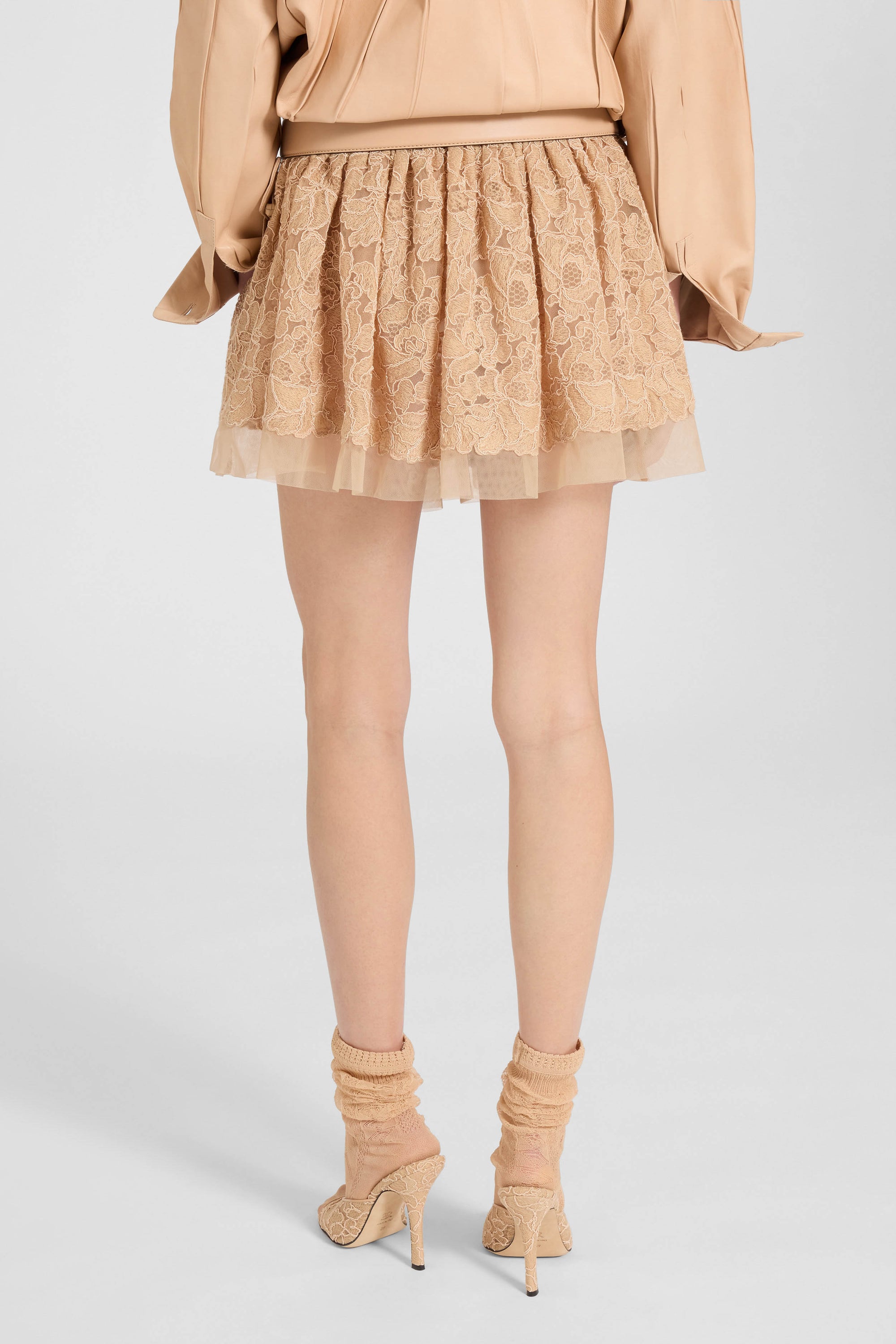 On the SS26 runway, the skirt completed a refined and contemporary look, paired with a deconstructed bra in technical fabric and a jacket in matching rebrodé lace, featuring a fitted waist and nappa trims inspired by corset construction, creating a harmonious and visually striking ensemble.
