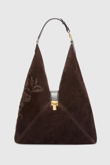 Large embroidered suede hobo bag