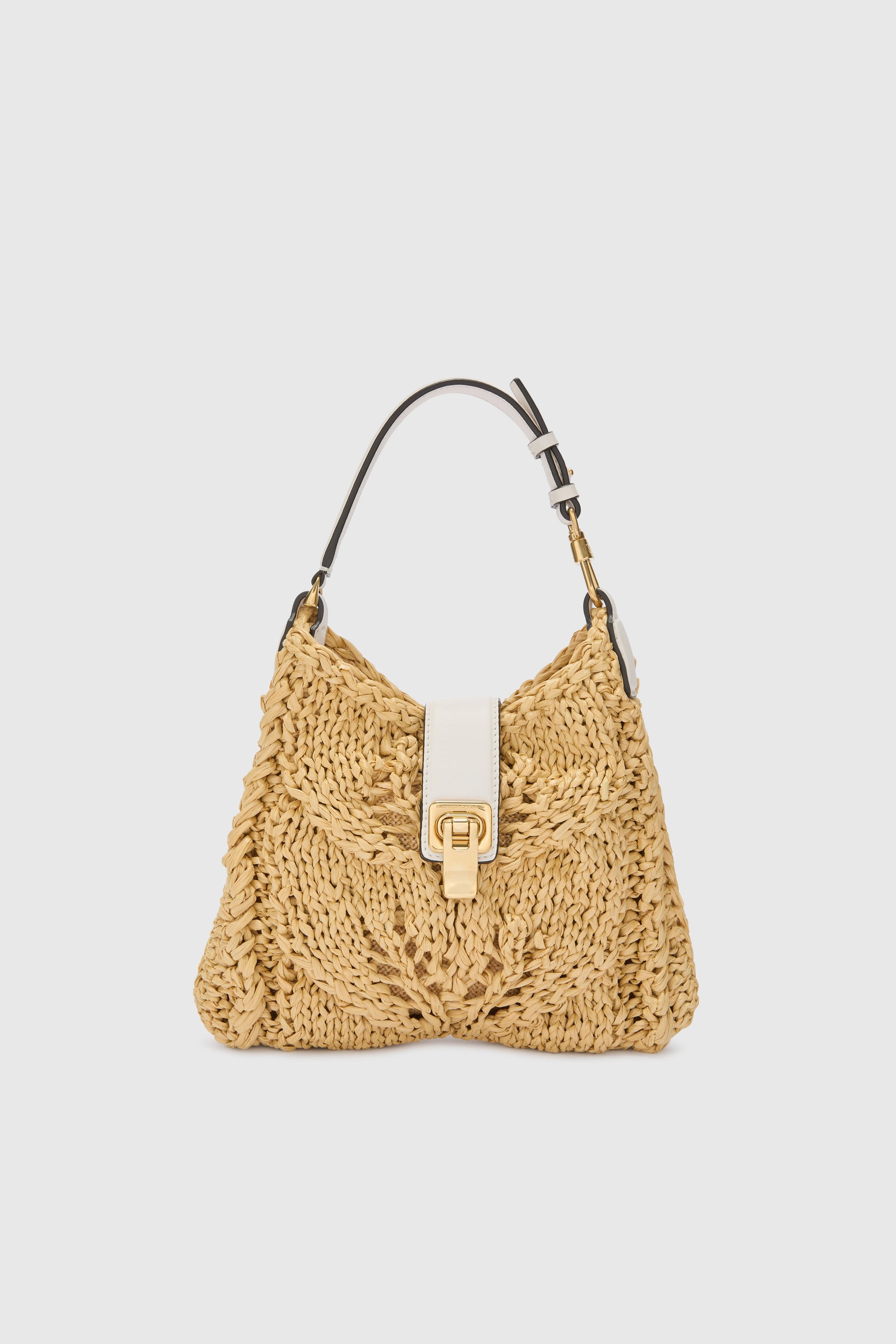 The Mini hobo bag in natural raffia is entirely handmade with raffia yarns, one of the maison’s signature materials. Its soft sack-inspired design embraces a minimal yet refined aesthetic, enhanced by a metal clip closure and a logo-engraved carabiner that add light and personality. Lightweight and versatile, it can be carried by hand or worn on the shoulder, perfectly expressing the less is more philosophy.
