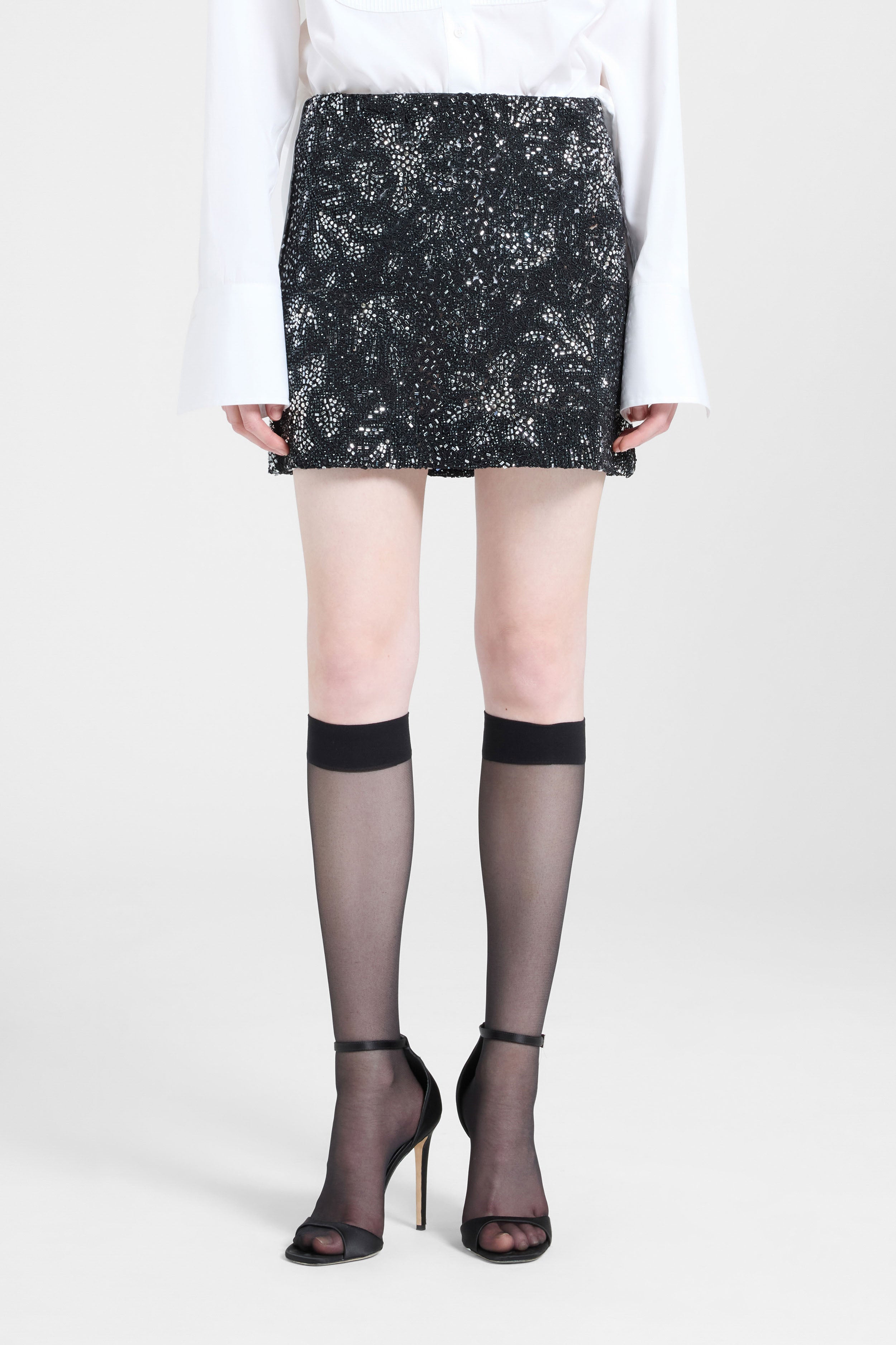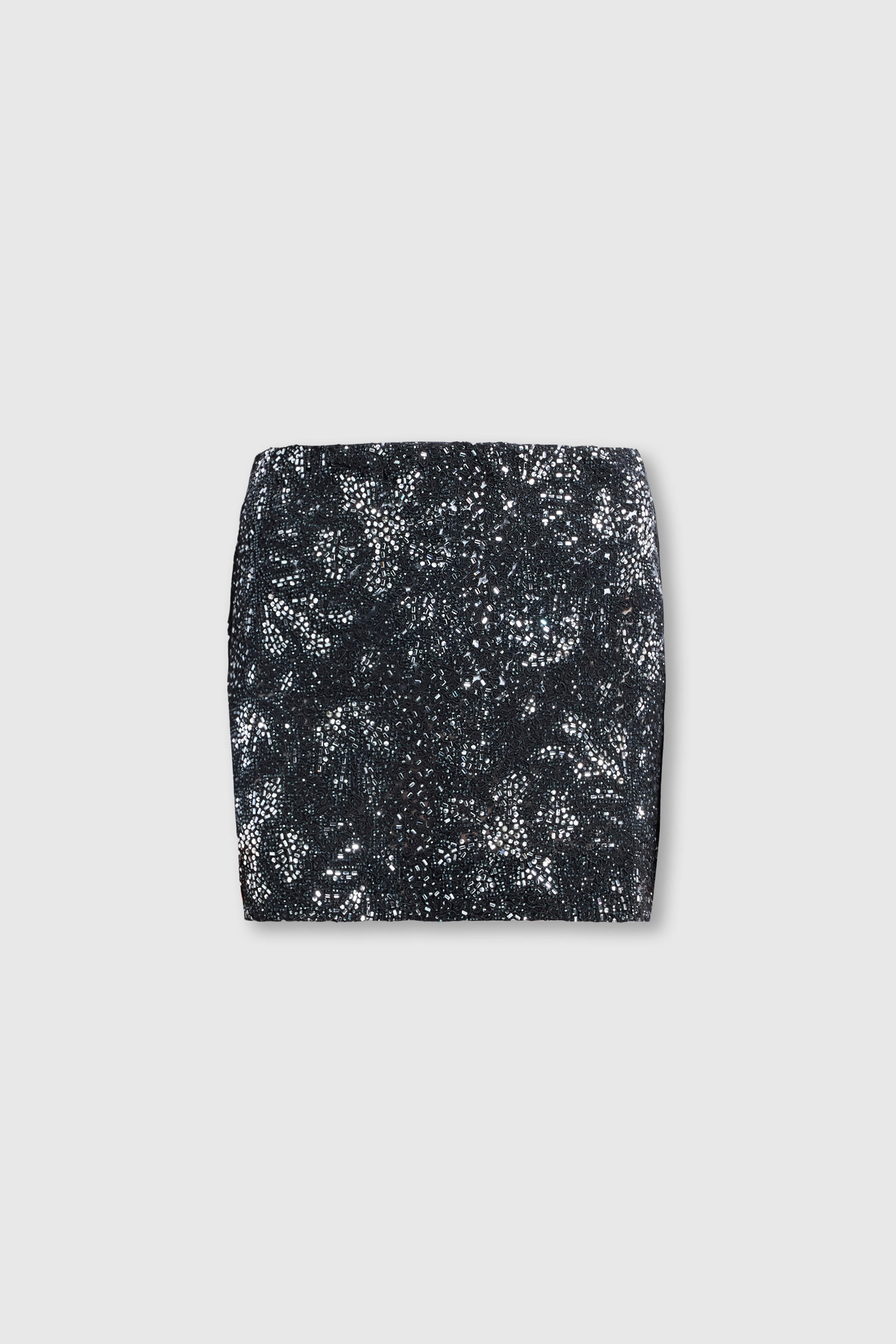 Part of the Holiday Capsule, this mini skirt captures the festive spirit with luminous elegance and refined allure. Crafted from the same fabric and workmanship as the long version, it features a clean silhouette enhanced by the sparkle of hand-applied stones and crystals, which form a delicate floral and rose motif inspired by lace. The shades of black and silver add depth and light, creating a precious three-dimensional effect. Perfect for evening looks during the festive season, it pairs beautifully with silk shirts or minimalist tops.