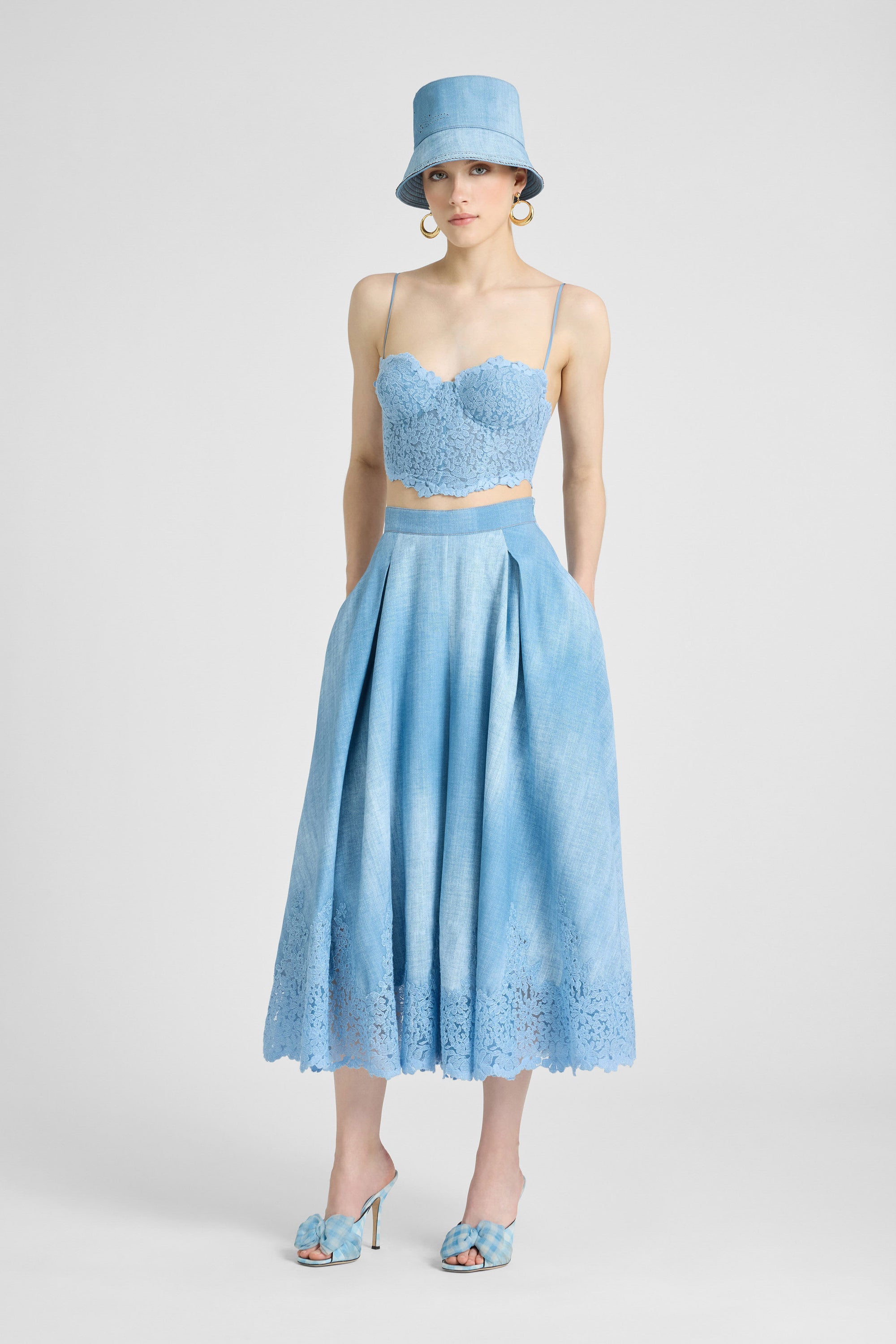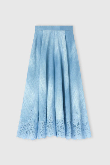 Wide Midi Skirt in Marocain Jeans Print with Rebrodé Lace