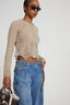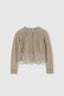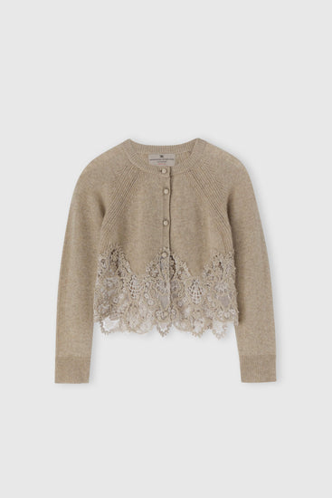 The edge of the collar and cuffs is worked in tight ribbing, ensuring adherence and comfort without sacrificing the softness of the yarn. The bottom is embellished with a delicate inlay in tone-on-tone wool rebrodè lace, applied by hand: the floral motif, designed exclusively by the maison, gracefully expresses the romantic and artisanal identity of the brand. The front buttons, wrapped in the same fabric as the cardigan, complete the garment with a sign of chromatic coherence and sartorial care.