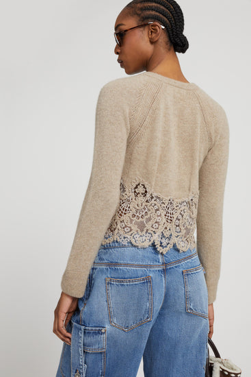 Cropped cardigan in pure cashmere with mandarin collar and rebrode lace