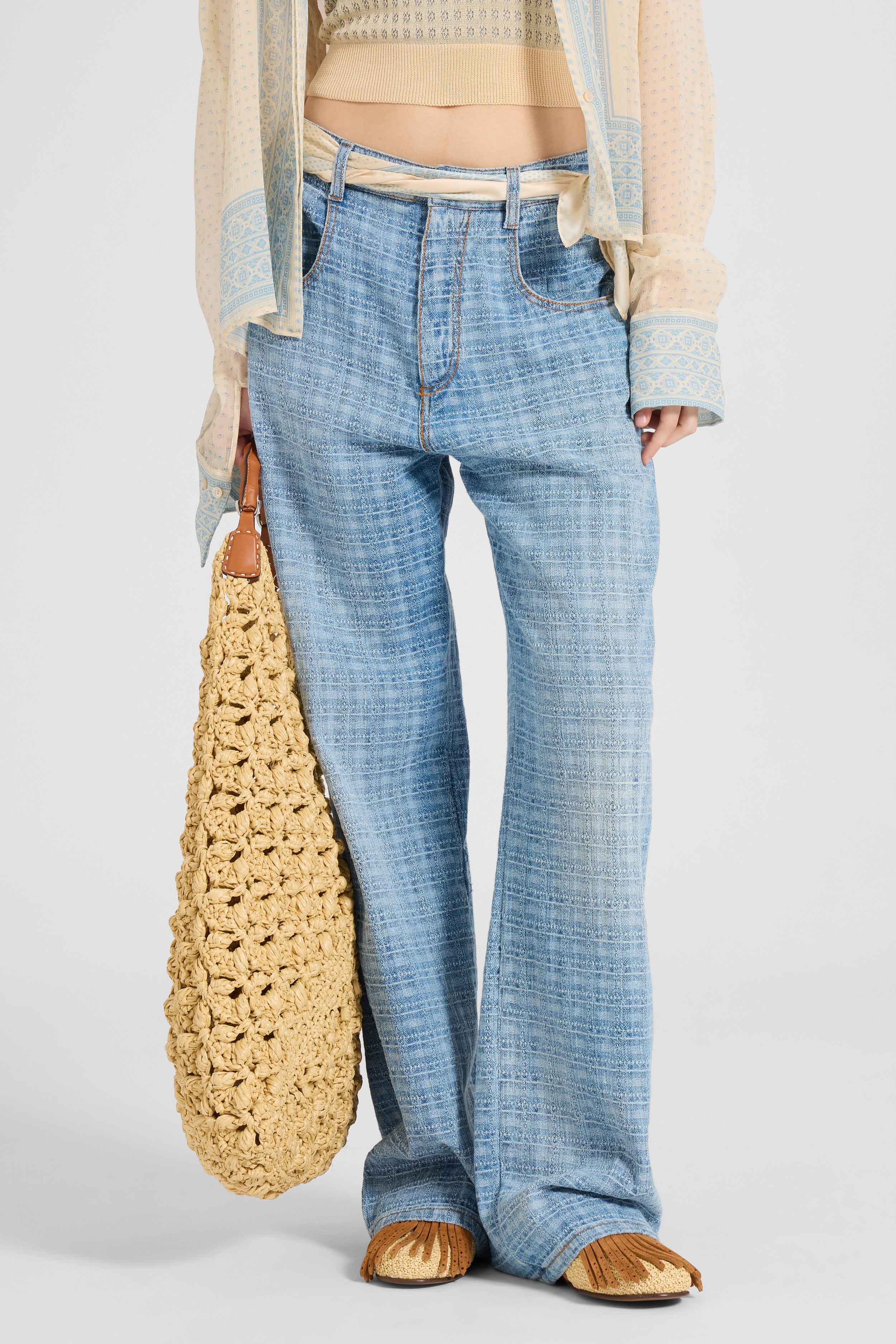 Baggy trousers in jacquard check denim with printed silk scarf belt