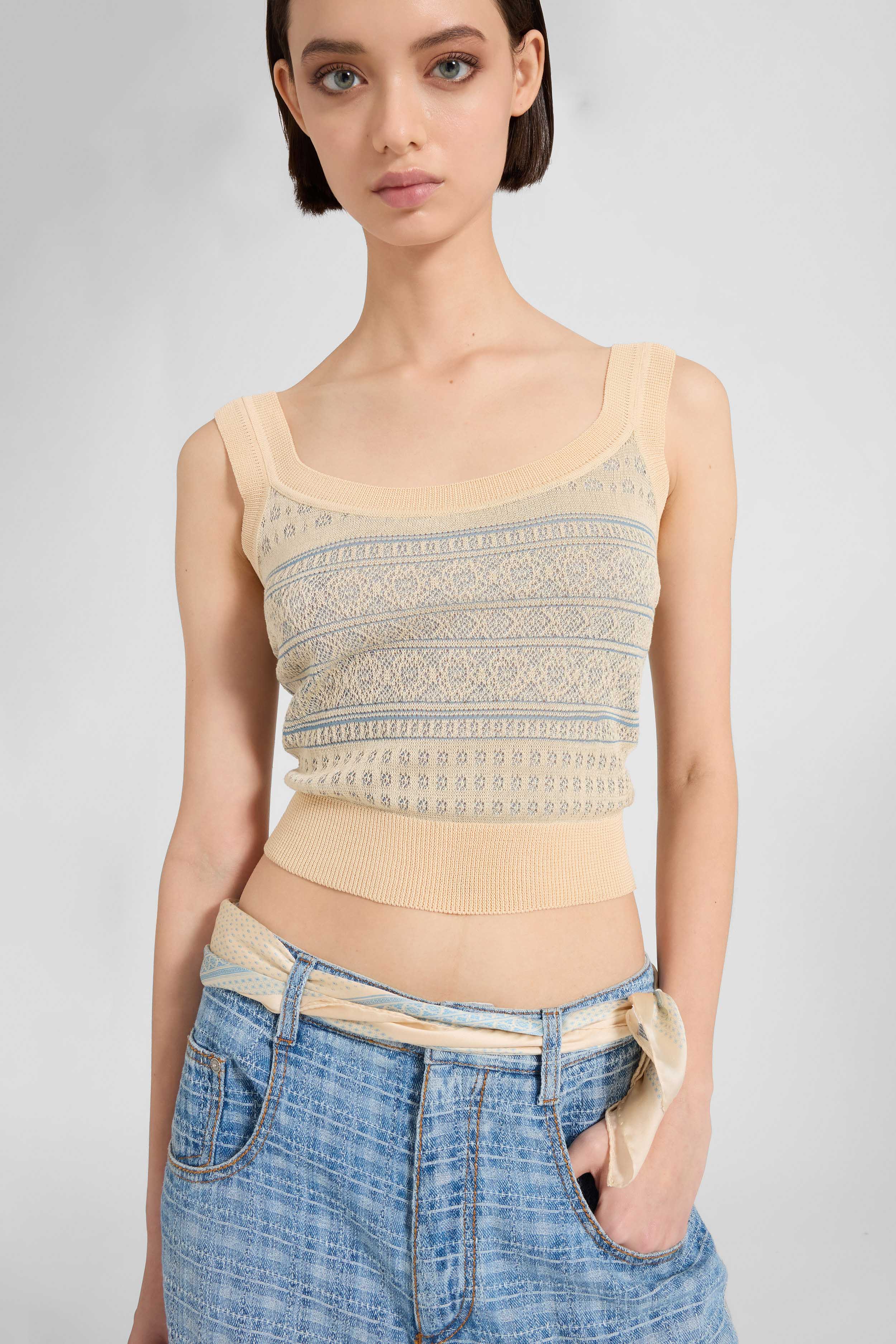 A sophisticated top that perfectly balances elegance and comfort. Crafted from a luxurious blend of silk, cotton, and viscose, the jacquard weave enriches the surface with subtle reflections, while the soft, fluid texture gently embraces the silhouette. The inner layer in white viscose ensures comfort and freshness against the skin, while the exterior combines the sheen of silk with the lightness of cotton, creating a versatile and refined piece. The bandana-inspired jacquard pattern, a leitmotif of the SS26 Runway Collection, adds a distinctive and recognizable touch, infusing outfits with style and personality. Perfect to pair with skirts or light trousers, or styled with jeans for a polished casual-chic look.