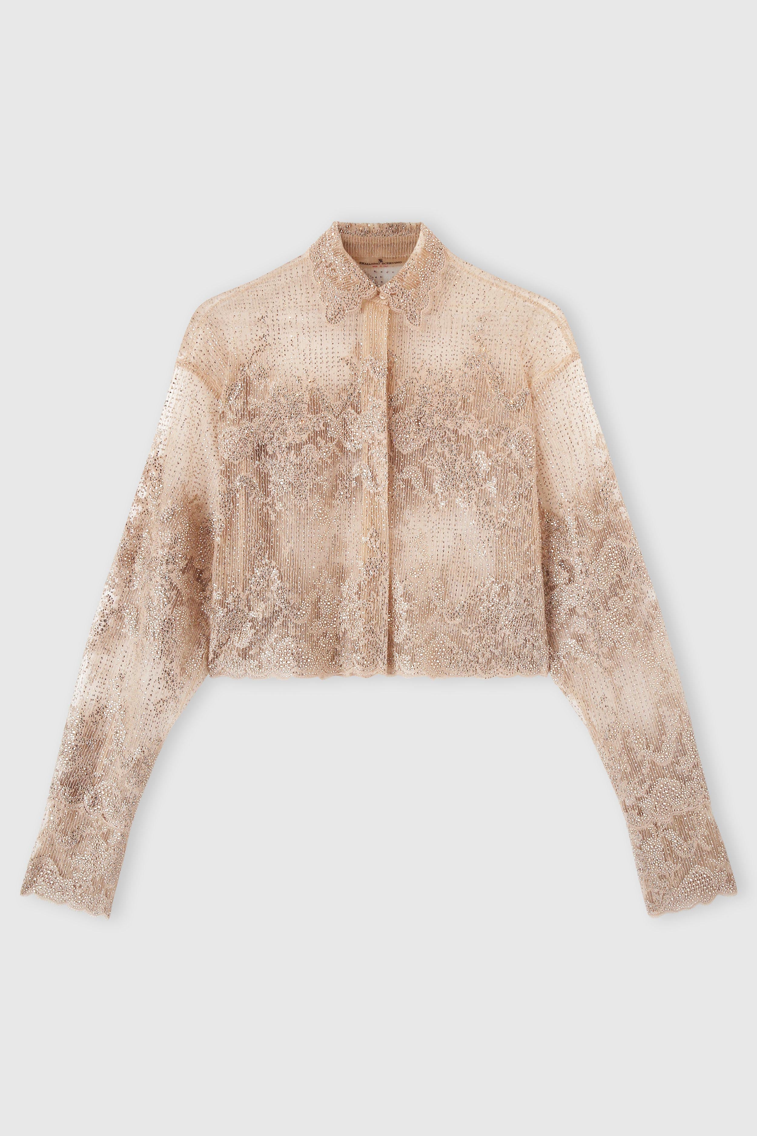 The embroidery evokes the finesse of French lace, further enhanced with hand-applied crystals, which catch the light and add movement to the piece. The result is a perfect balance of lightness, elegance, and craftsmanship, making the shirt a standout piece for sophisticated outfits or luminous layering.
