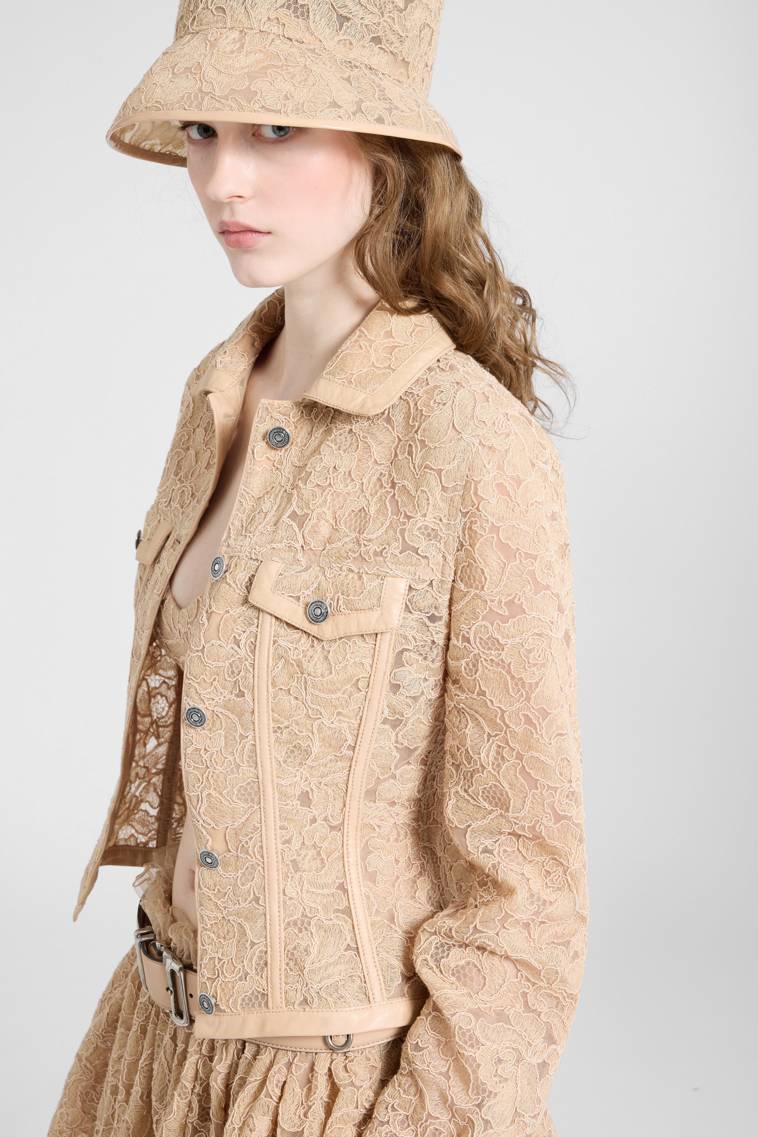 This structured jacket combines the delicacy of floral rebrodé lace with the definition of tone-on-tone nappa trimming along the edges and bustier lines, transforming the piece into a showcase of craftsmanship and contemporary femininity. The bustier construction emphasizes the waist, creating a sculpted and sophisticated silhouette without sacrificing lightness.
