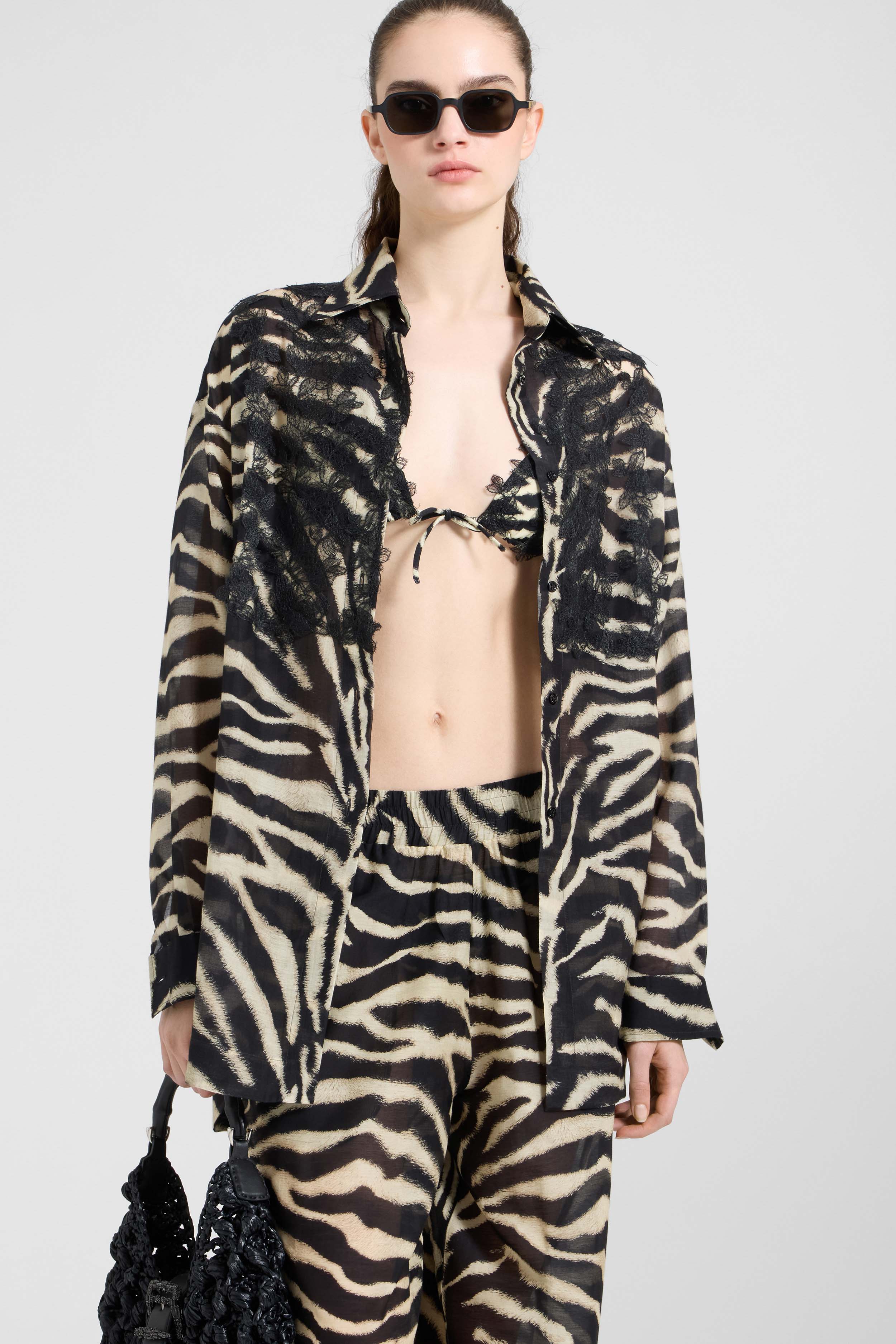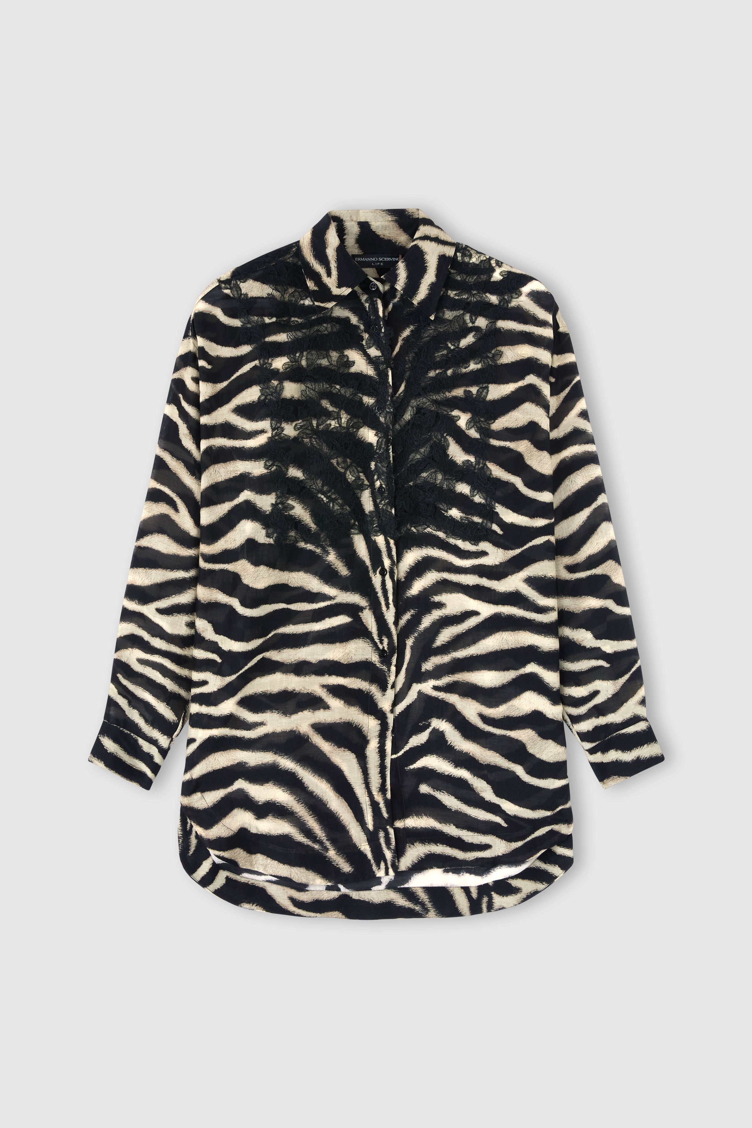 Cotton and silk blend shirt with zebra print and black rebrodé lace