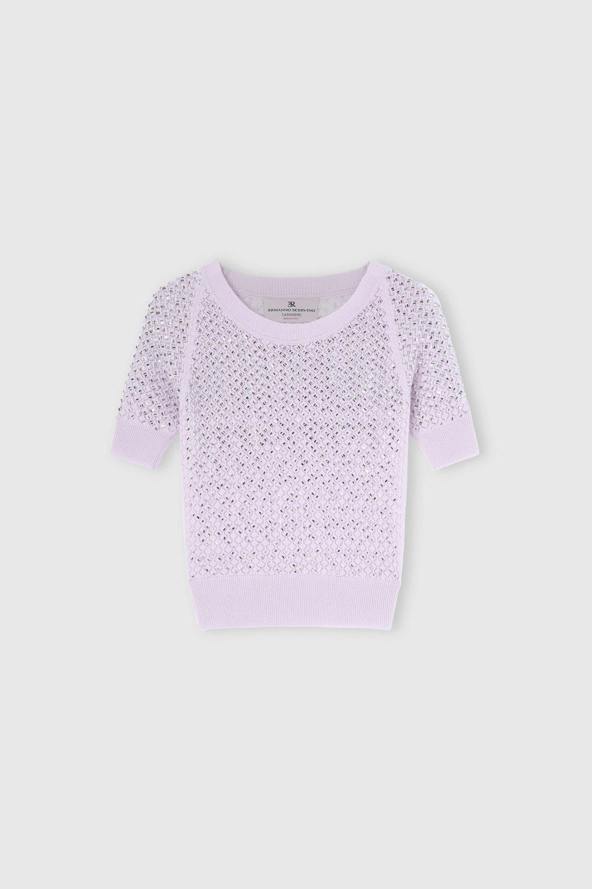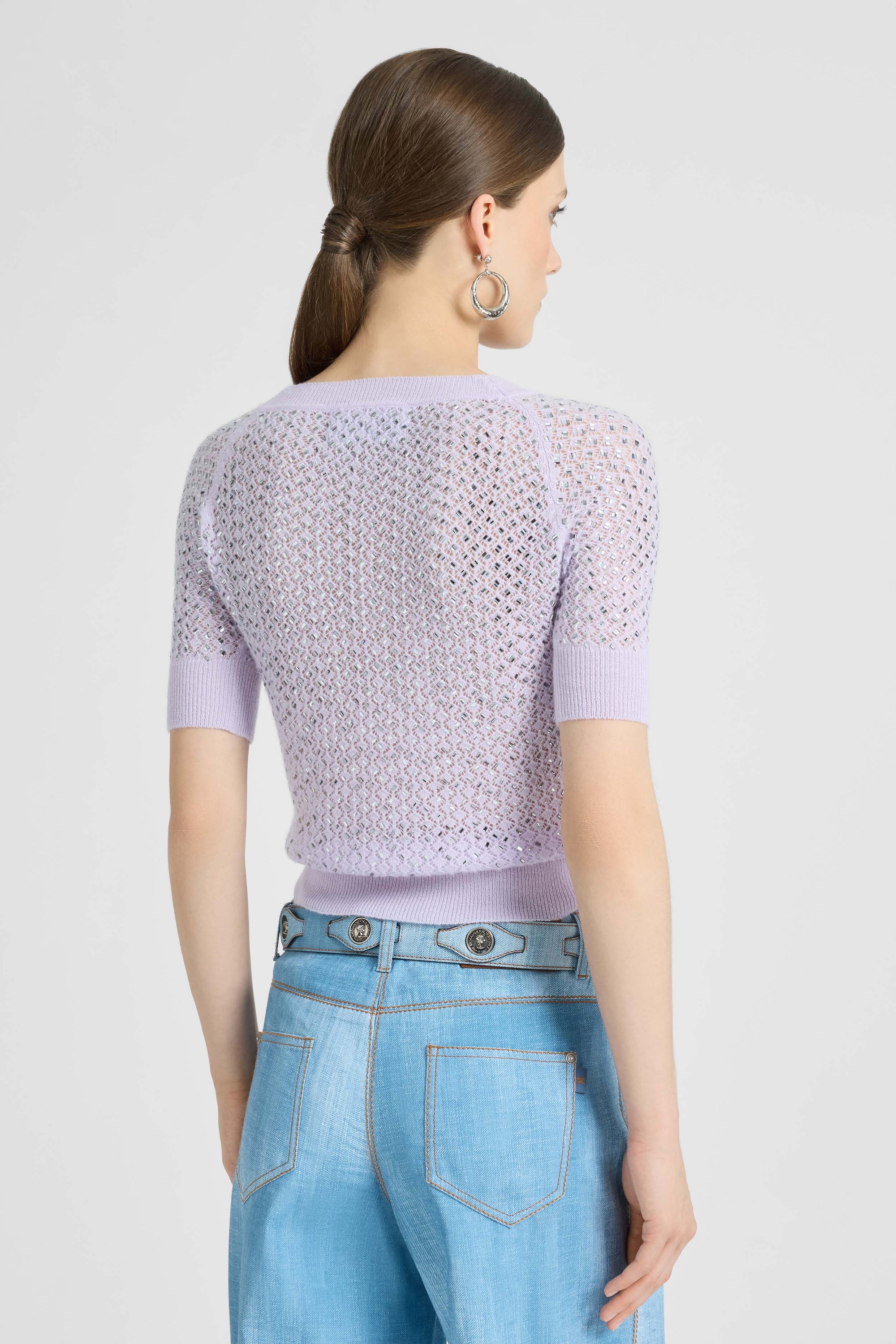 A lightweight pure cashmere top, designed for summer while maintaining the softness and luxury of our iconic materials. The openwork knit creates a delicate play of transparency, enhancing the silhouette and adding movement. Hand-applied crystals catch the light, producing an elegant and sparkling effect.
