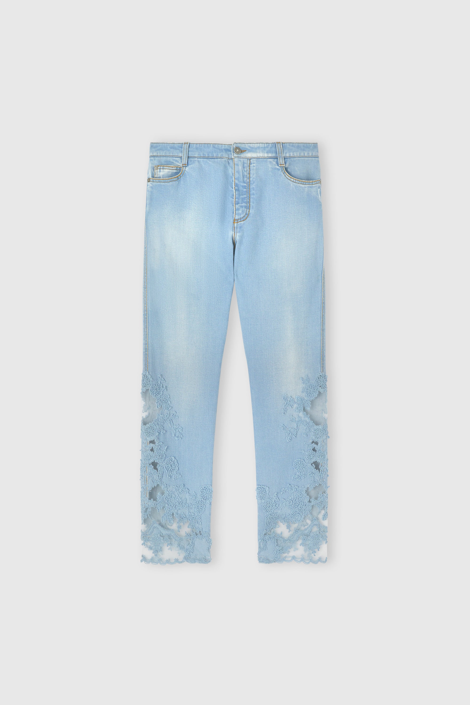 Straight-leg denim trousers with hand-applied rebrodè lace