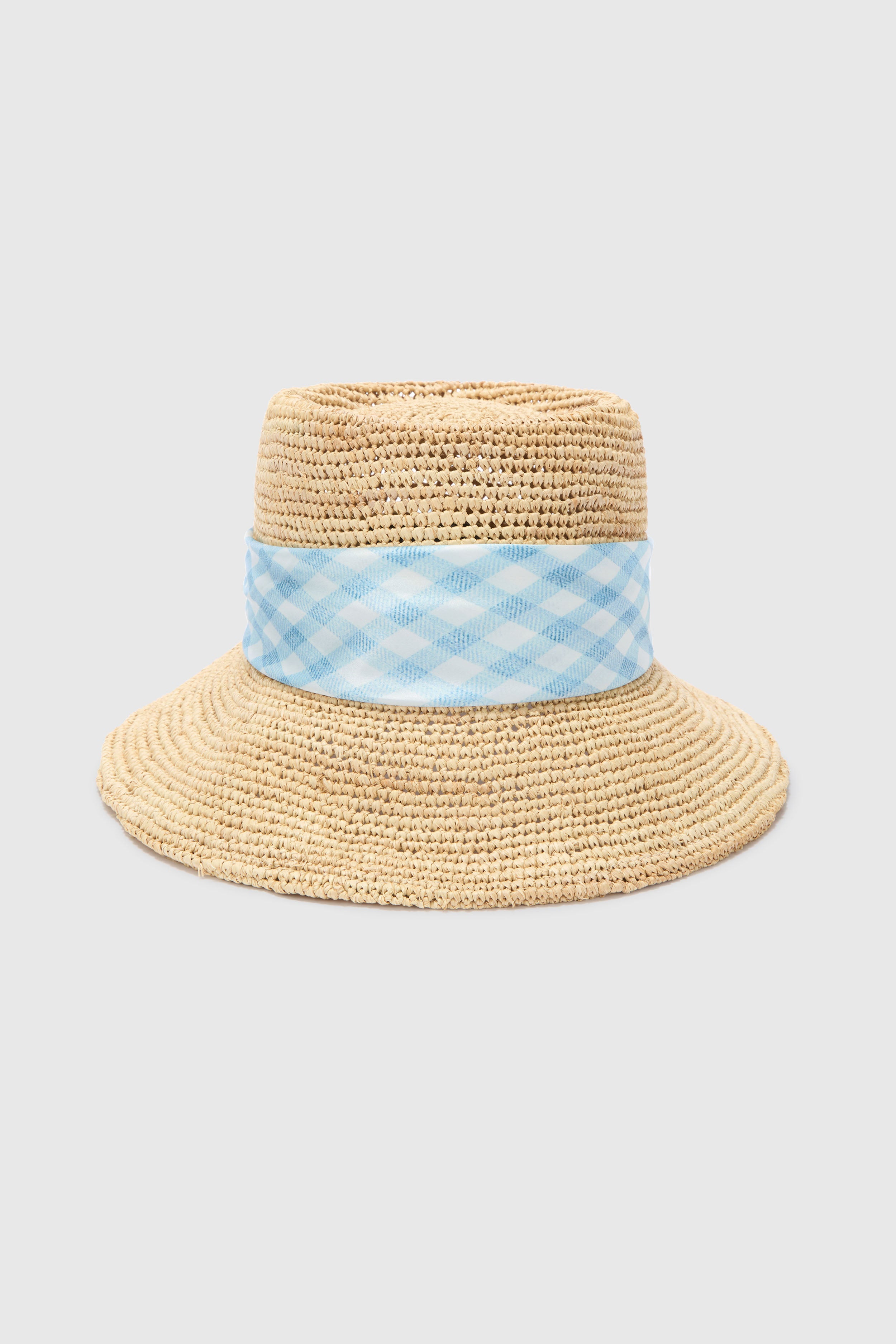 Wide-Brim Hat with Silk Scarf in White and Blue Vichy Print