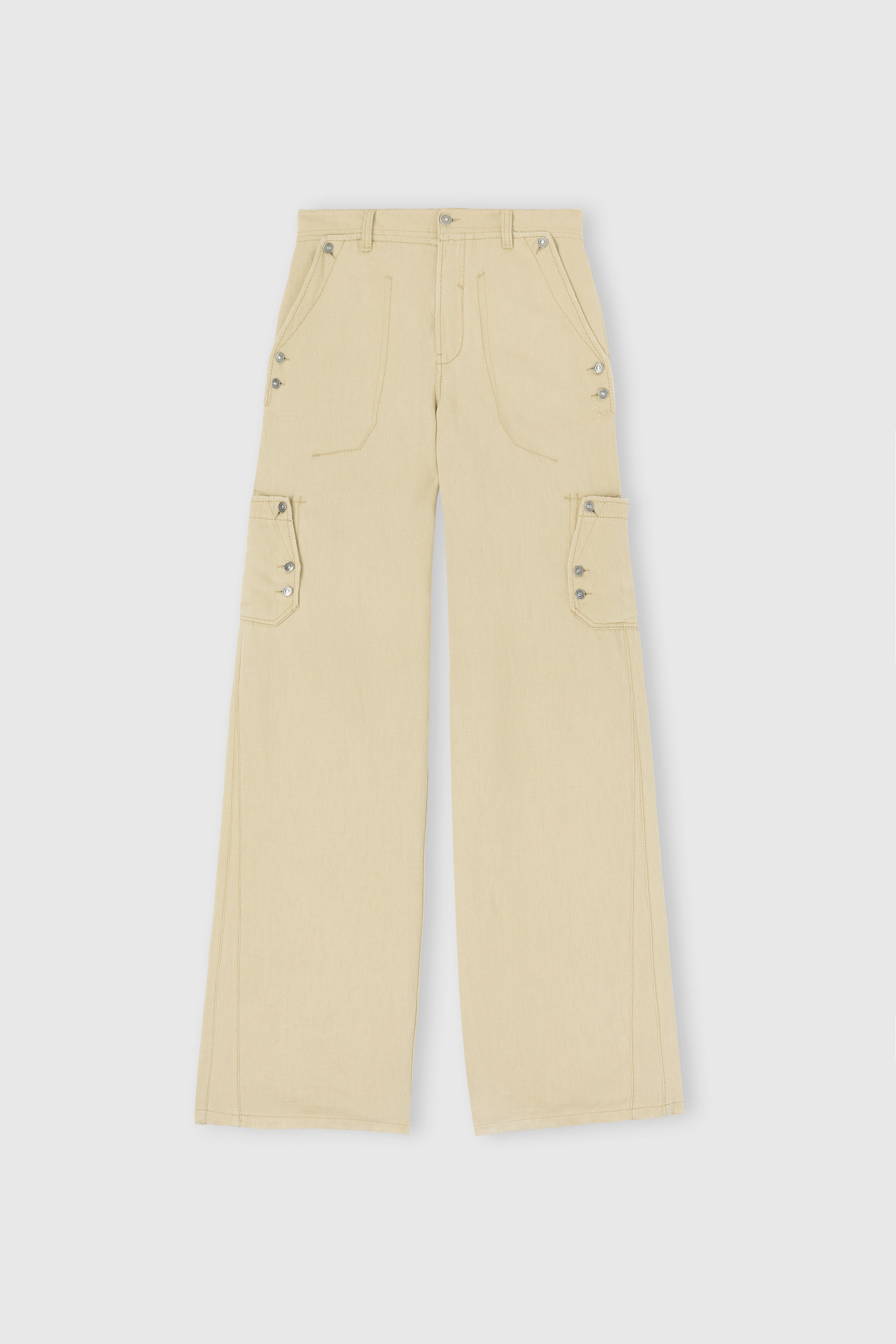 A modern and functional piece: these cargo trousers are crafted in lightweight denim in a cotton-linen blend, offering comfort and breathability. The soft yet structured cut flatters the silhouette without sacrificing practicality, while the side pockets with silver-tone contrast buttons add a contemporary and bold touch. Ideal for casual-chic outfits or paired with jackets and blazers for a more refined look.
