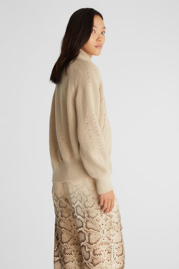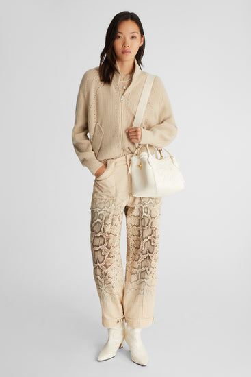 Classic bomber jacket design in 100% cashmere. The jacket features a perforated pattern that accentuates the figure.