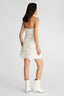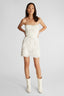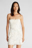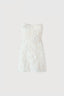 A lace mini sculpture dress with a straight neckline; the bust is accentuated by a pointed structure, a characteristic element of this collection. The garment, with a romantic design, is completely covered with lace appliqués on tone-on-tone rebrod tulle and the floral appliqués are made and applied by hand. The metal closure is side and hidden.