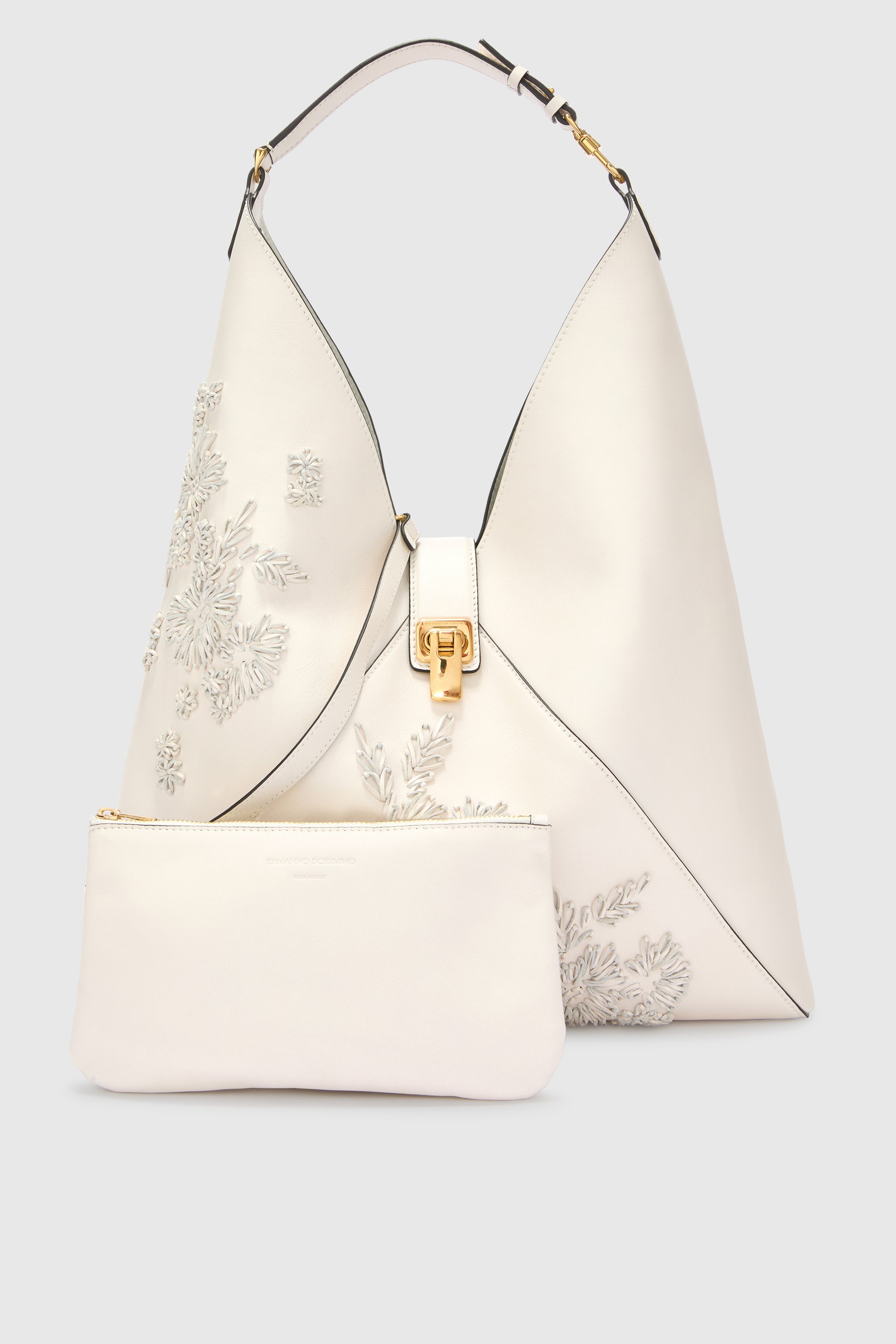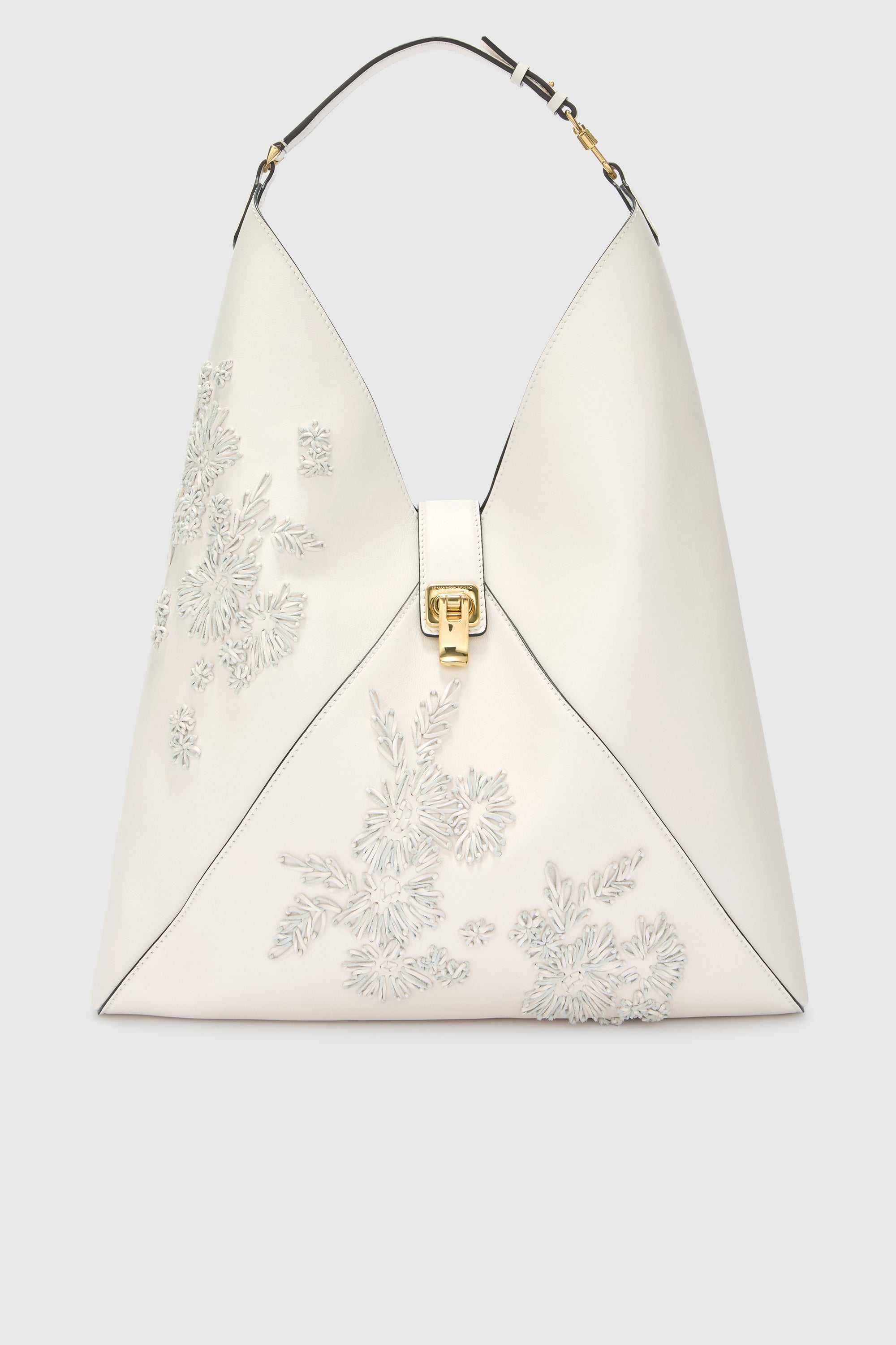 TheLarge is the hobo version of the iconic bag, crafted from top-quality calf leather with a natural finish and a minimalist look. The design is enriched by delicate hand-applied floral embroidery made with a ribbon in the same leather as the bag body, adding subtle refinement without weighing down the silhouette. The clip closure and logo-engraved carabiner provide light, security, and a distinctive touch. Designed to be carried over the shoulder, it perfectly combines functionality and chic style.