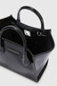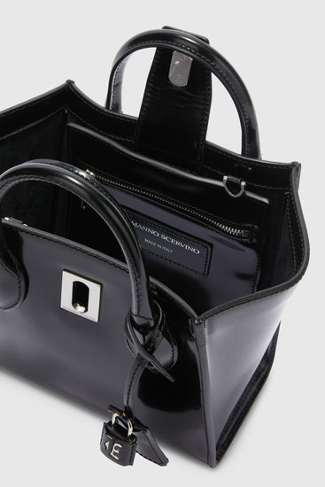 Mini Maggie in brushed calfskin with double handle and matching crust interior. The closure is personalised with a logo-embossed padlock, while the bottom has metal feet. Detachable leather shoulder strap. The dimensions are 19*17*10.