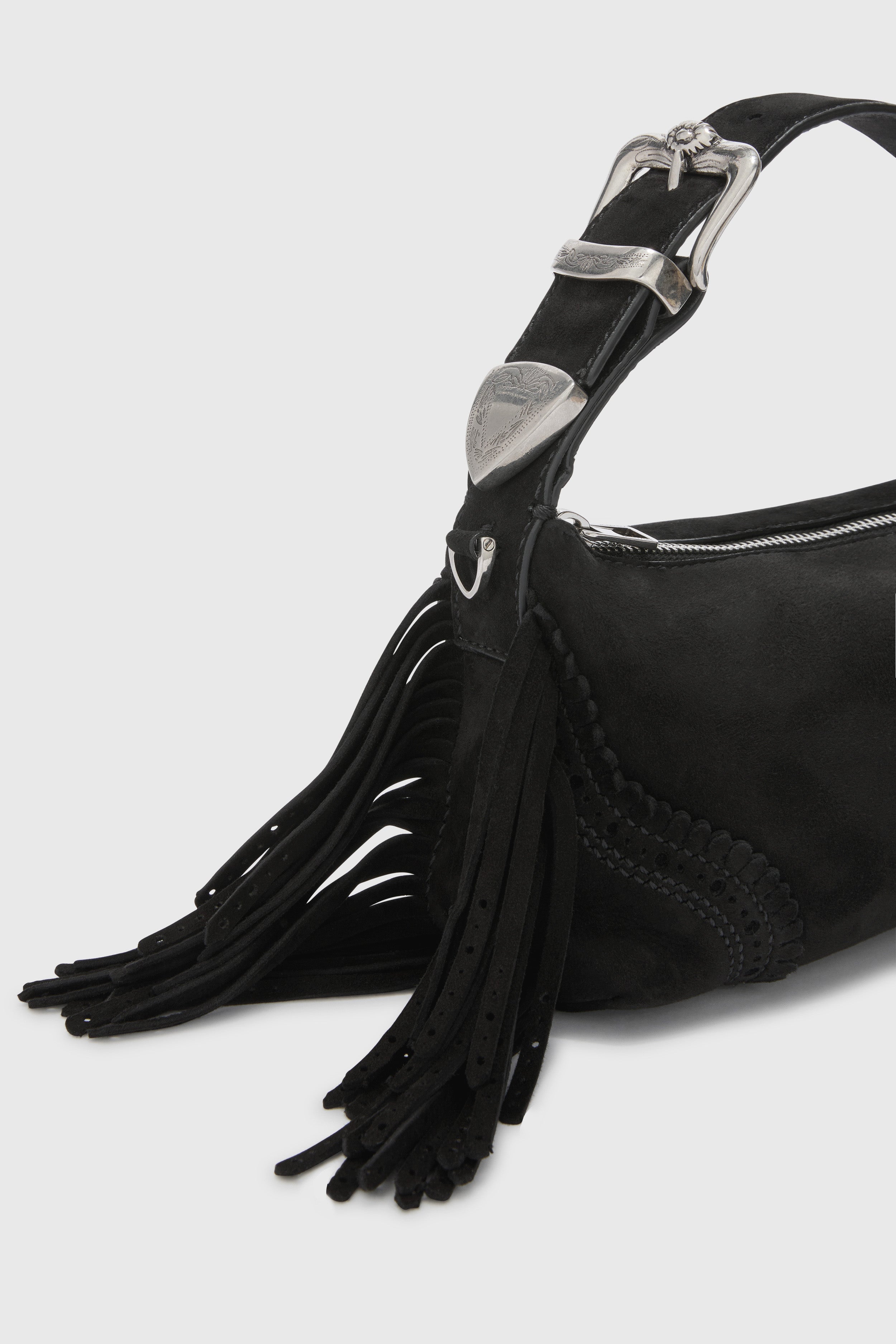 The Candy in black suede is a shoulder bag with a refined, understated charm. The soft, lightweight suede provides elegance and comfort, while the zip closure and adjustable handle with bespoke buckle ensure practicality and security. Fringes on the sides and perforated corners echo the collection’s signature motif, adding dynamism and character to this versatile accessory. Perfect for chic, everyday contemporary looks.