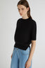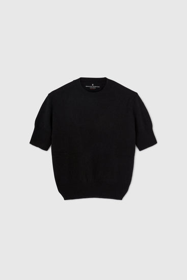Pull en pur cachemire à manches courtes et encolure ronde. Le bord de l'encolure, de la chemise et des manches est réalisé en micro-côtes pour plus de douceur.